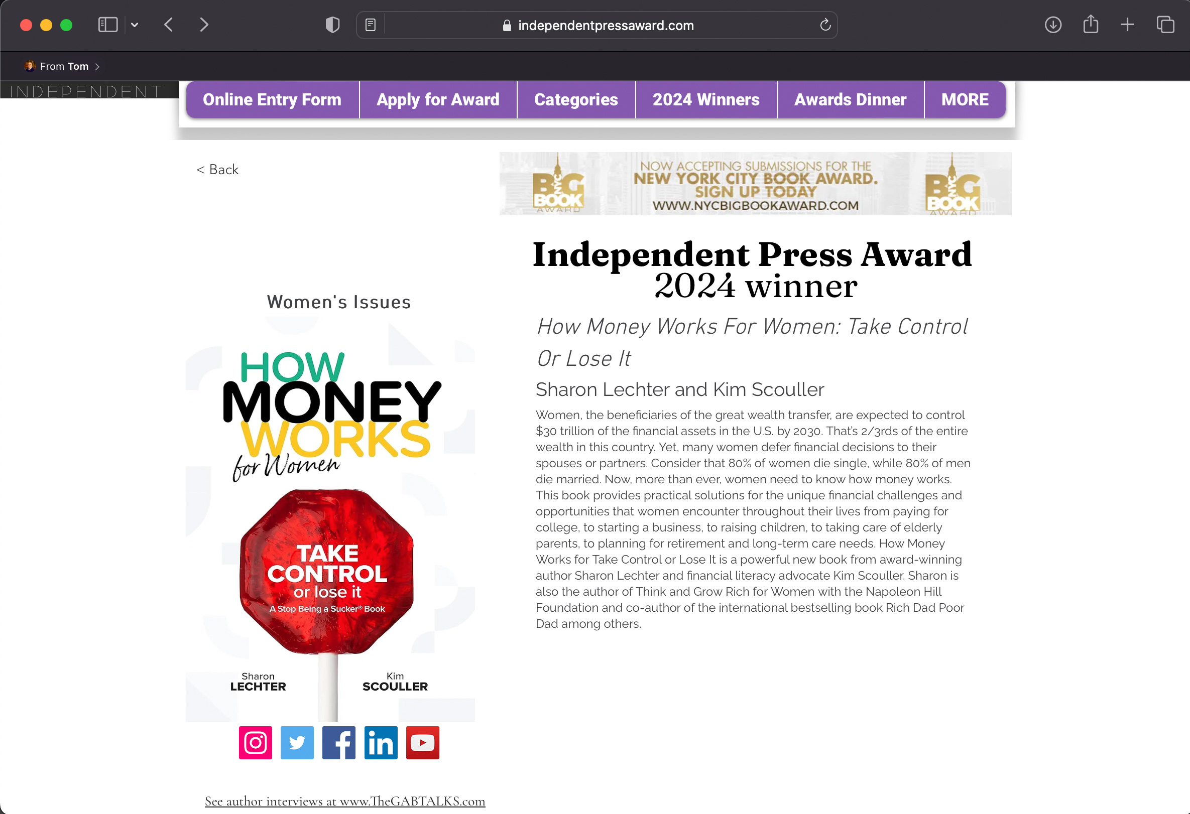 The HowMoneyWorks For Women book, co-authored by Sharon Lechter and Kim Scouller, has been recognized with the prestigious Independent Press Award for 2024.