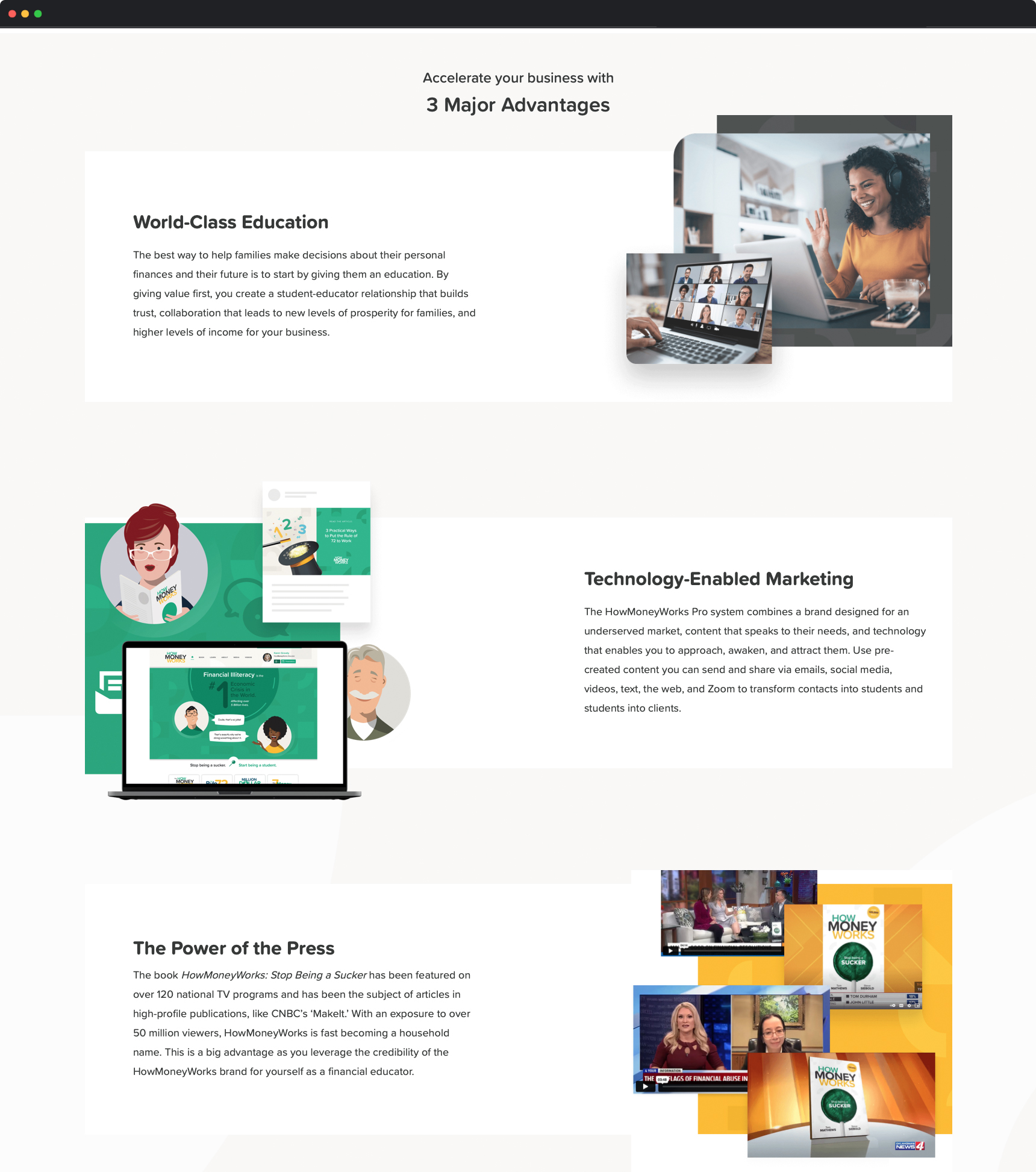 Introducing your new, personalized HowMoneyWorks Pro website, a game changer for attracting potential financial educators to your business. Going beyond just a page, this comprehensive website is designed to impress prospects who have been captivated by our HowMoneyWorks educational system and are exploring opportunities to become financial educators.