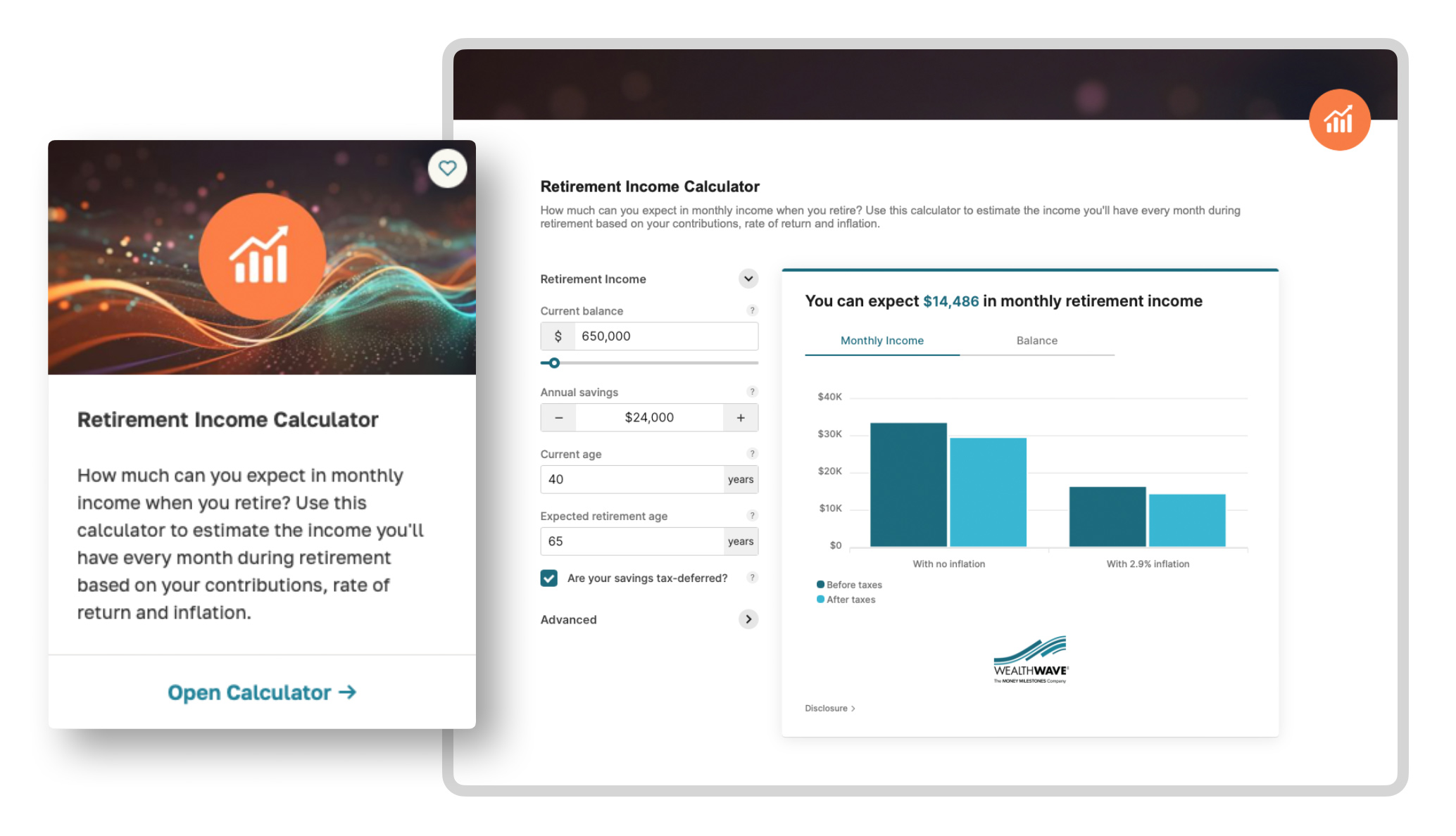 Sylvia is 49 years old and plans to retire at 65. She wants to know if her current savings and monthly contributions will provide her a desired $5,000 monthly income in retirement. Sarah can input her current savings, expected returns and monthly contributions to determine if she's on track."