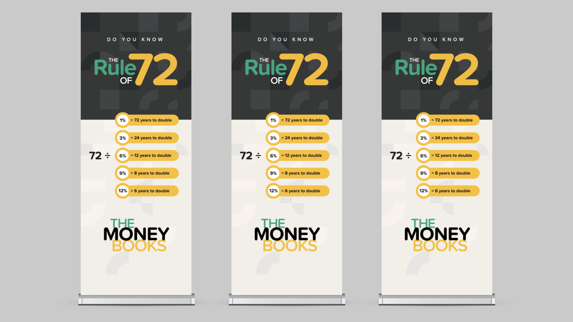 Download the high resolution art for our pull-up banner featuring our HowMoneyWorks Official Logo with the Rule of 72‍