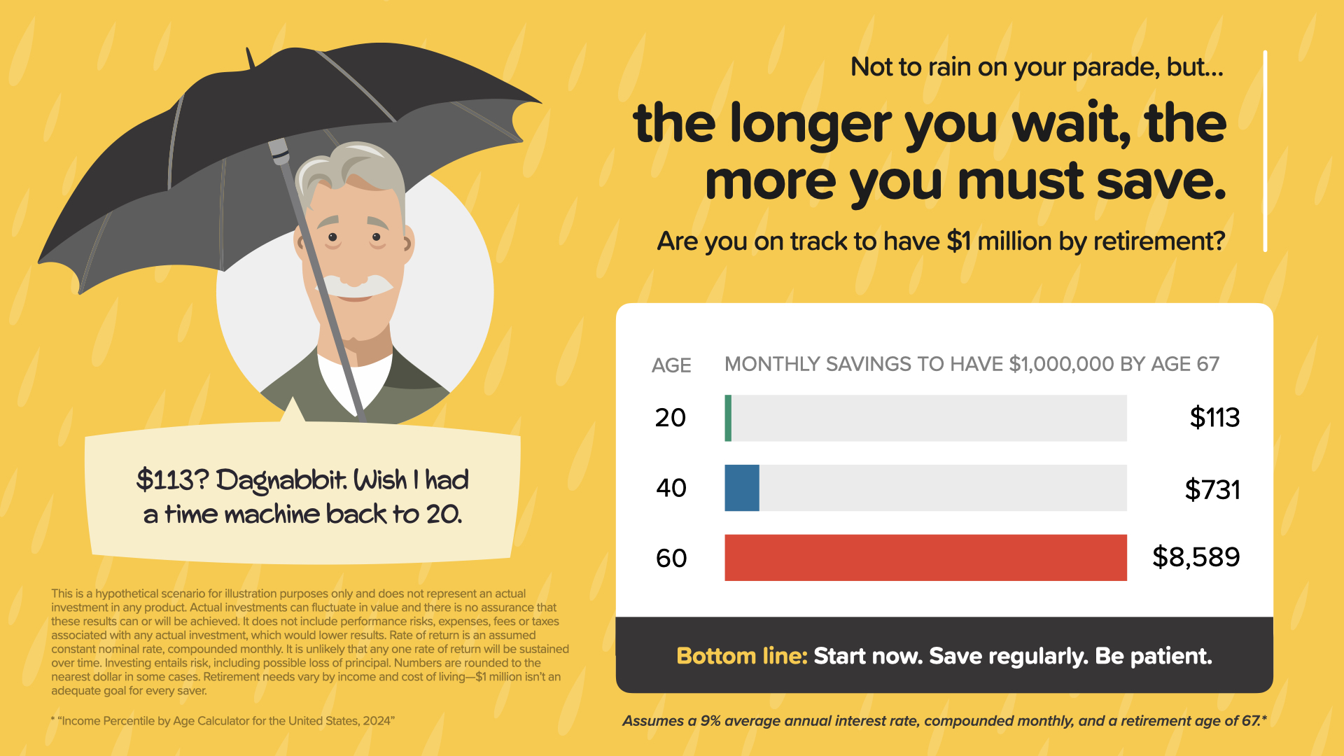 Let’s not rain on your parade, but waiting to save for retirement means you’ll have to save much more later. For example, if you start saving at age 20, you need to set aside $113 monthly to reach $1 million by age 67. But if you wait until you're 60, that amount skyrockets to $8,589 monthly!