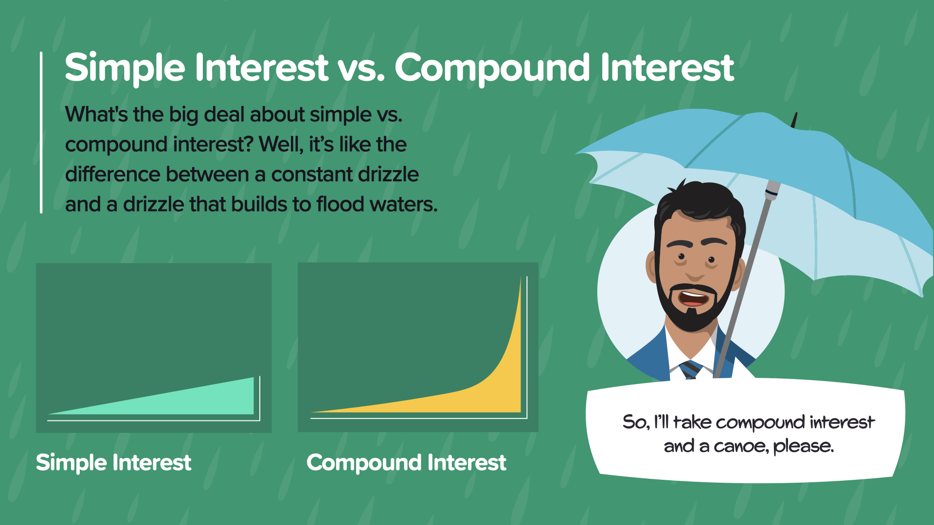 Let's talk about the magic of compound interest compared to simple interest. Imagine simple interest as a steady, light rain, while compound interest is like a rain that intensifies into a rainstorm, gathering momentum over time.