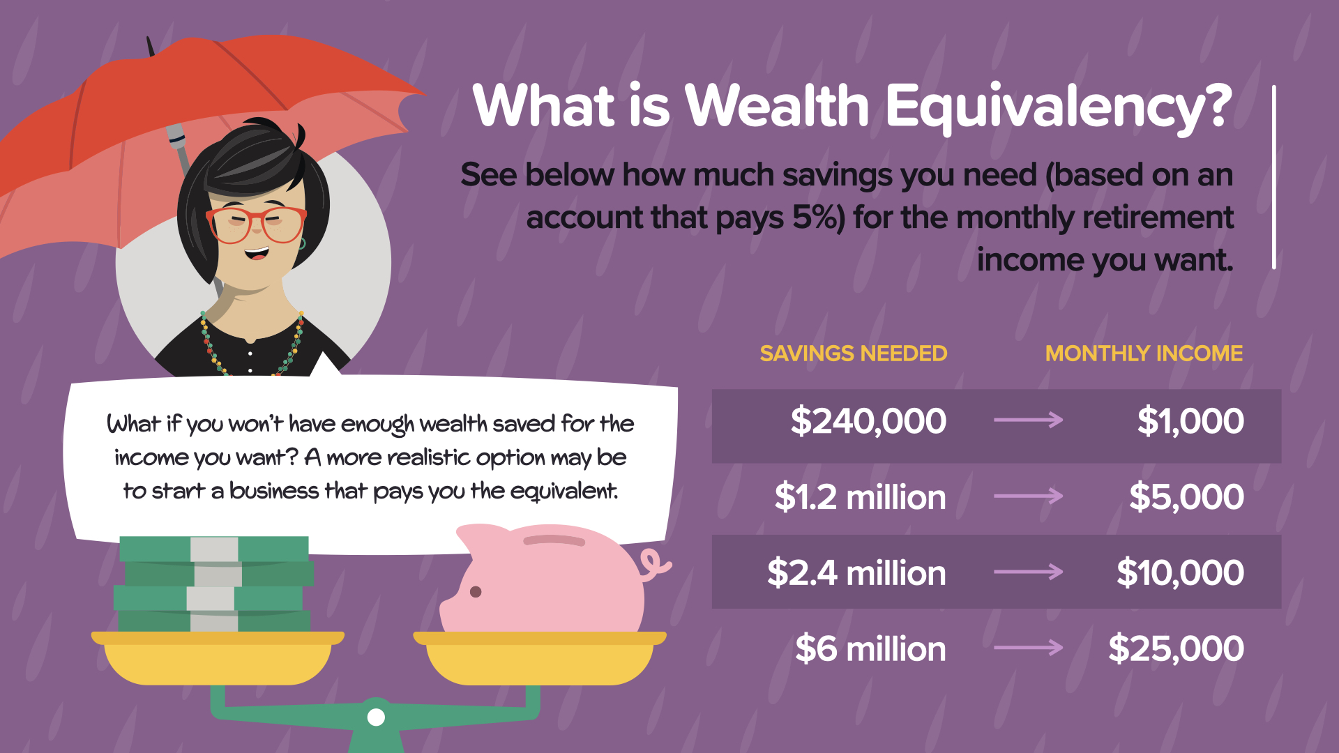 As we just discussed in the previous slide, 'the longer you wait, the more you must save' to reach your financial goals by retirement. Now, let’s expand on this with the concept of wealth equivalency to see how much you would need to save, considering a constant return rate, to achieve your desired monthly retirement income.