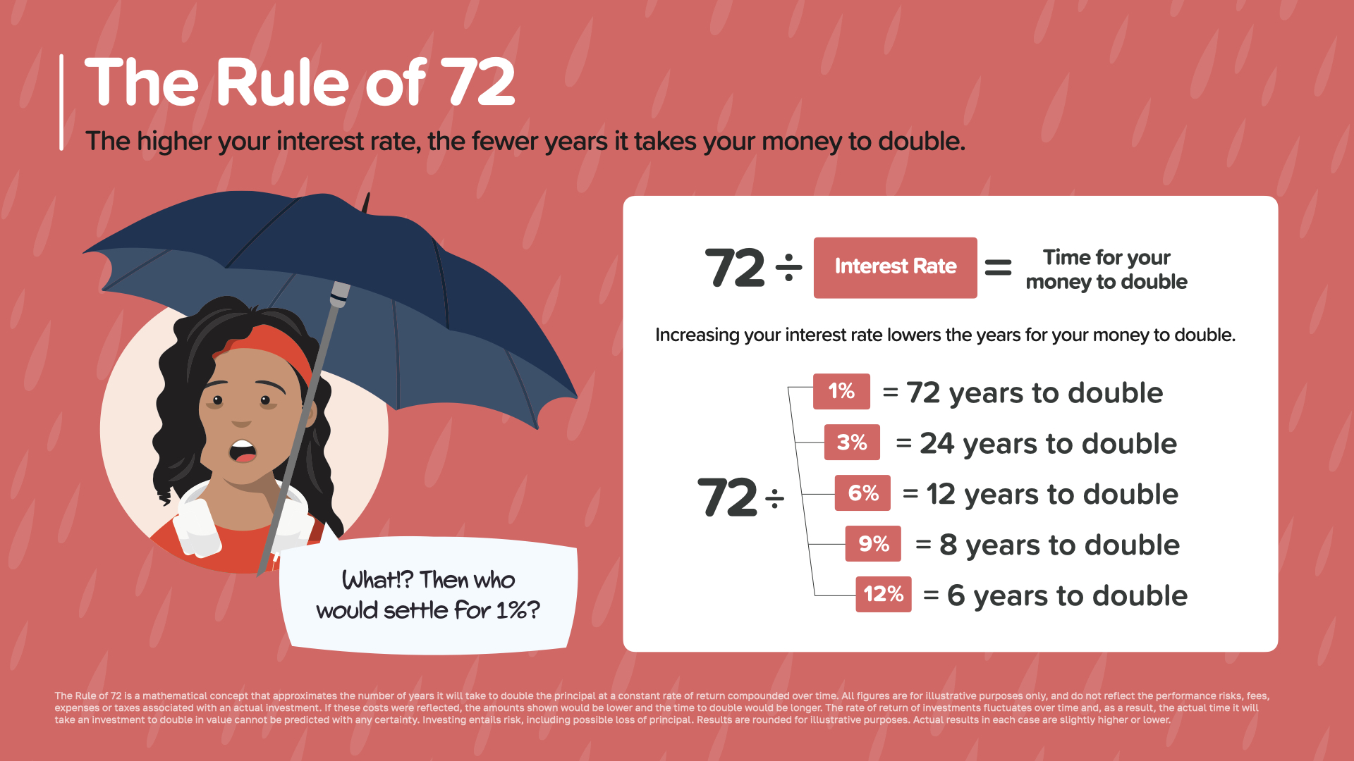 The Rule of 72, simply put, works like this: divide 72 by your interest rate to find out approximately how many years it will take for your money to double. For instance, at 1% interest, it takes 72 years for money to double, but at 12%, it only takes 6 years! This rule serves as a quick and easy way to measure the effectiveness of different rates of return.