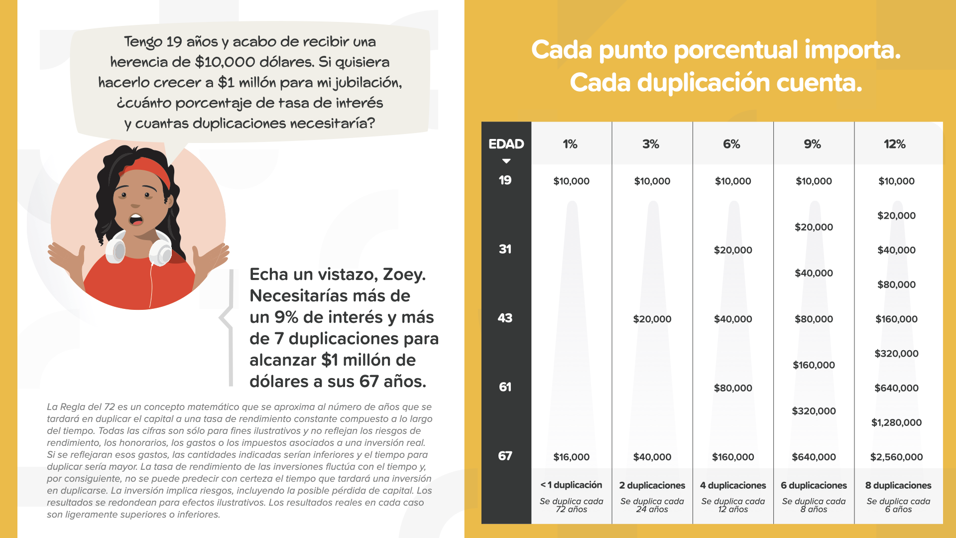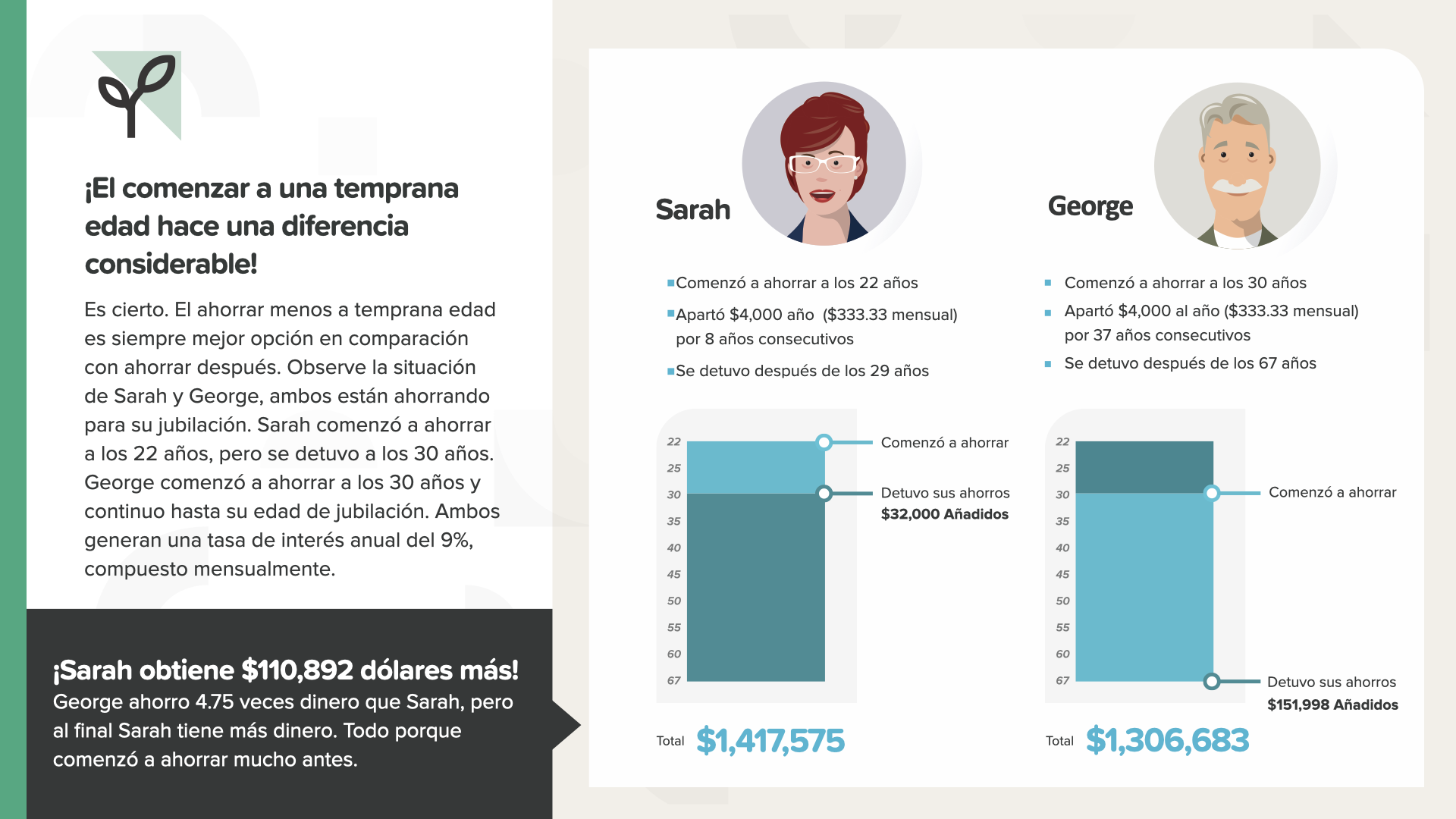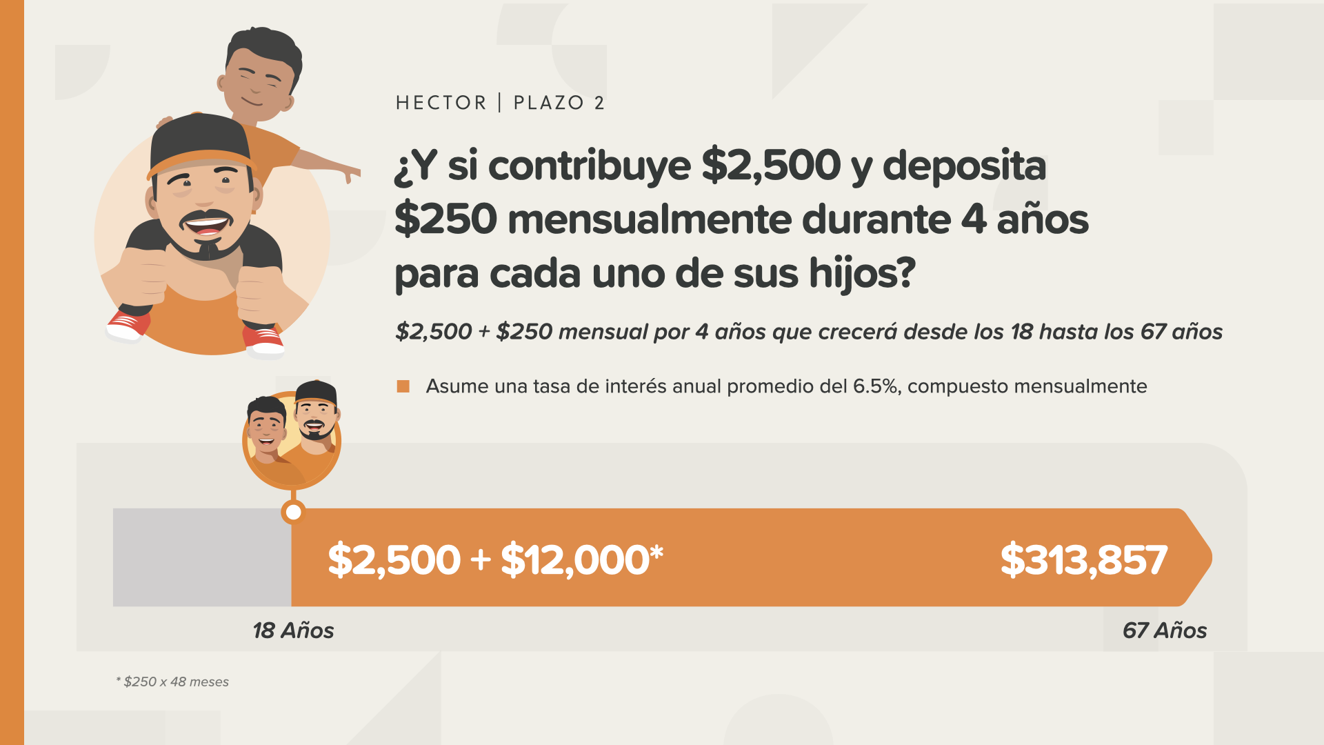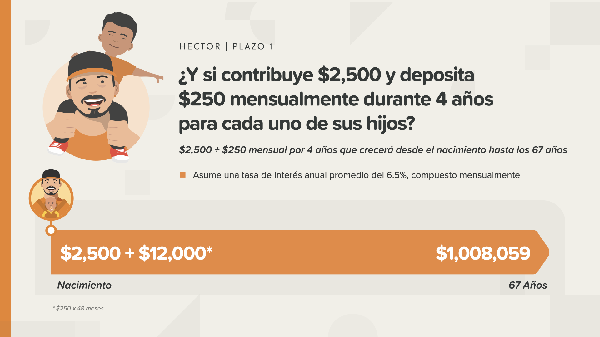 Héctor no tiene $13,000, pero quiere que su hijo se jubile con un millón de dólares. Sus familiares y él trabajan juntos y logran ahorrar sólo $2,500 dólares para luego depositar sólo $250 dólares mensualmente durante los próximos 4 años. Entonces, como por arte de magia, también darán justo en el blanco. Su hijo también se retirará con un millón de dólares.
