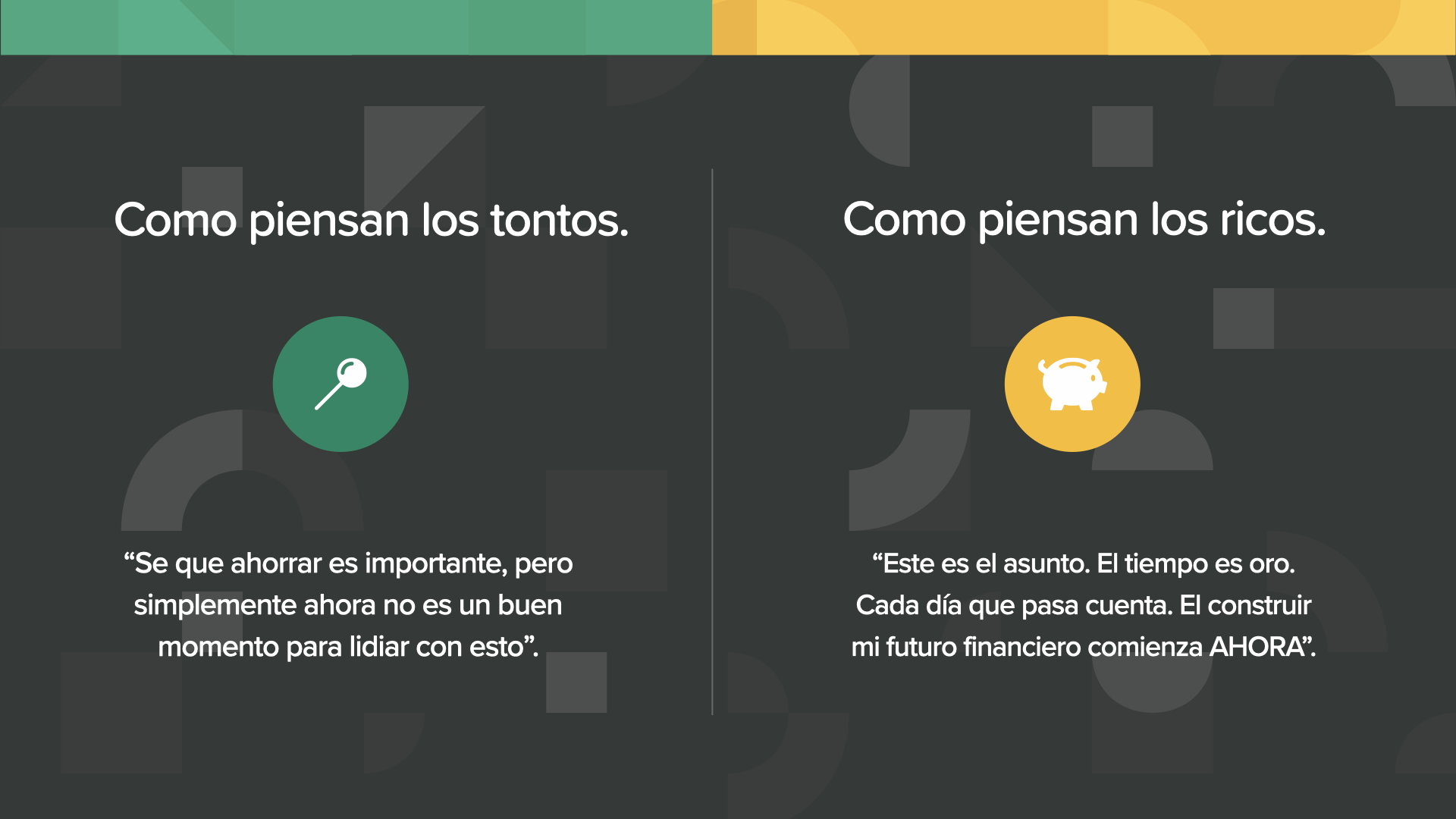 La gente con mentalidad de tontos nunca piensa que es un buen momento para ocuparse de esto. Los de mentalidad rica siempre comienzan tan pronto como pueden, lo cual es AHORA, si no antes.