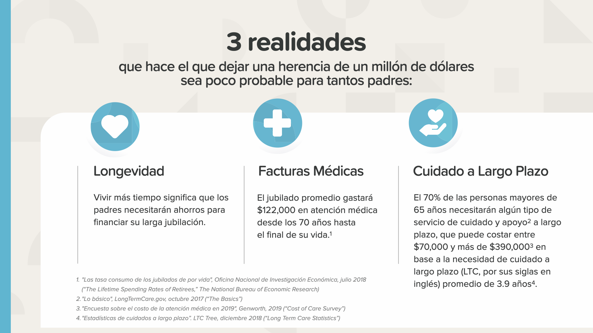 Sabemos lo difícil que es para los padres jubilados preservar una herencia para sus hijos adultos. Ya que las personas de tercera edad están viviendo más tiempo, casi todos sus ahorros pueden que sean necesarios para cubrir décadas de gastos, incluyendo facturas médicas y cuidados a largo plazo. Esta nueva realidad de longevidad puede eliminar la posibilidad de dejar una herencia como antaño.