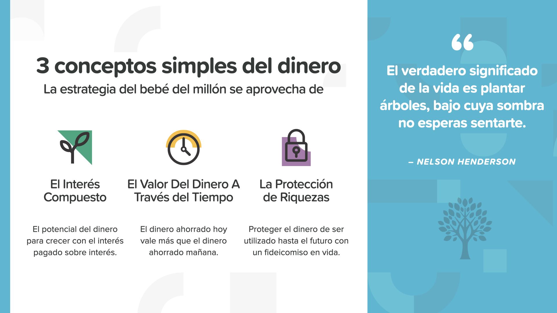 Él bebe del millón (Million Dollar Baby) se basa en 3 conceptos simples de dinero: el poder del interés compuesto, el valor temporal del dinero y la protección de la riqueza. Esta es una de mis citas favoritas... Nelson Henderson dijo, "El verdadero significado de la vida es plantar árboles, bajo cuya sombra no esperas sentarte".