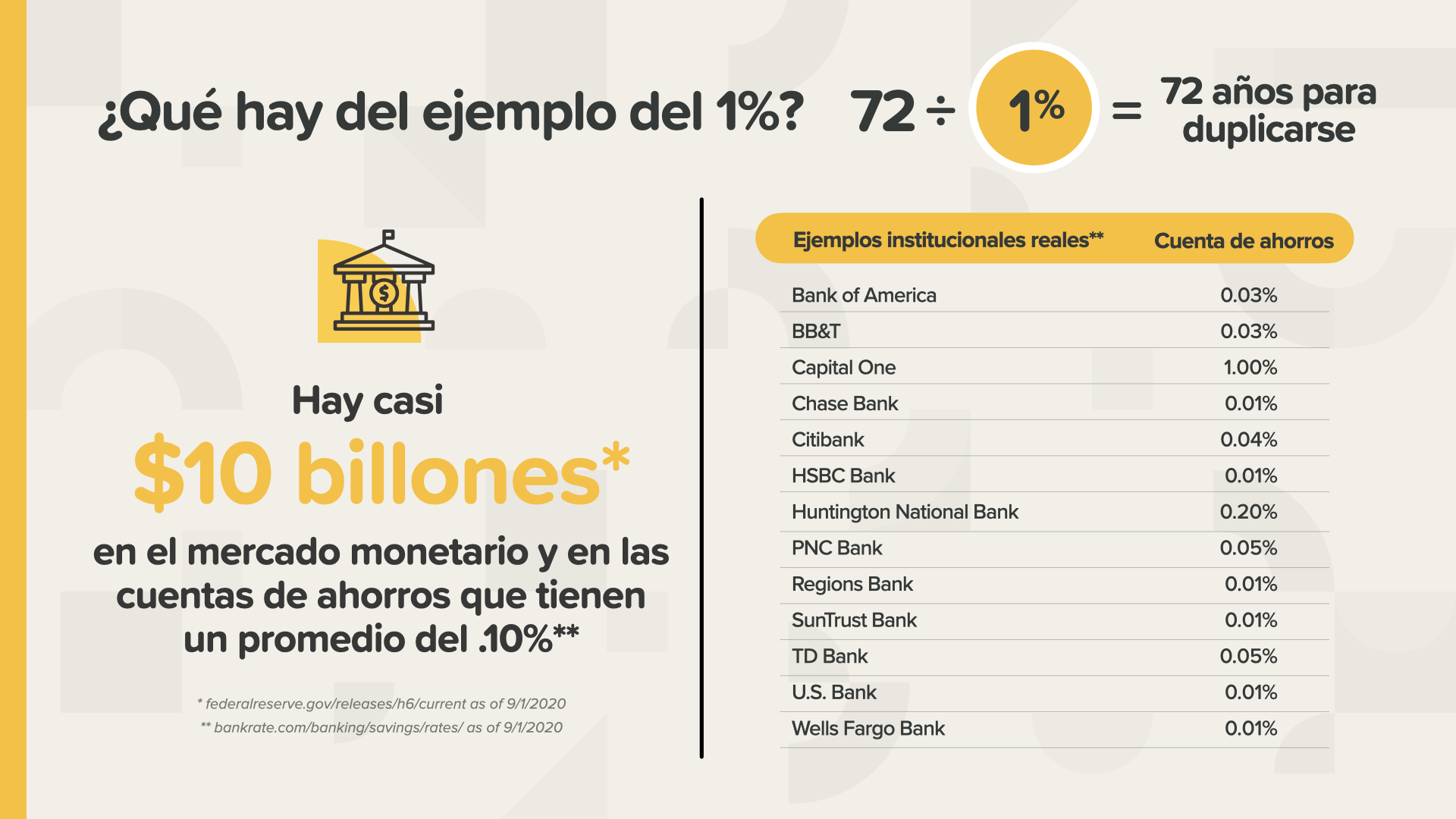 ¿Recuerda la pregunta sobre el 1%? ¿Alguien elegiría 72 años para duplicar su dinero? ¡Claro que sí! Porque la gente no sabe cómo funciona el dinero, hay casi 10 billones de dólares en cuentas en libreta de ahorros que promedian el 0.10%. Eso es sólo una fracción del 1%. Cuando la CNBC hizo una reseña de nuestro libro hace unos meses, esta es una de las cosas que señalaron como casi increíble.