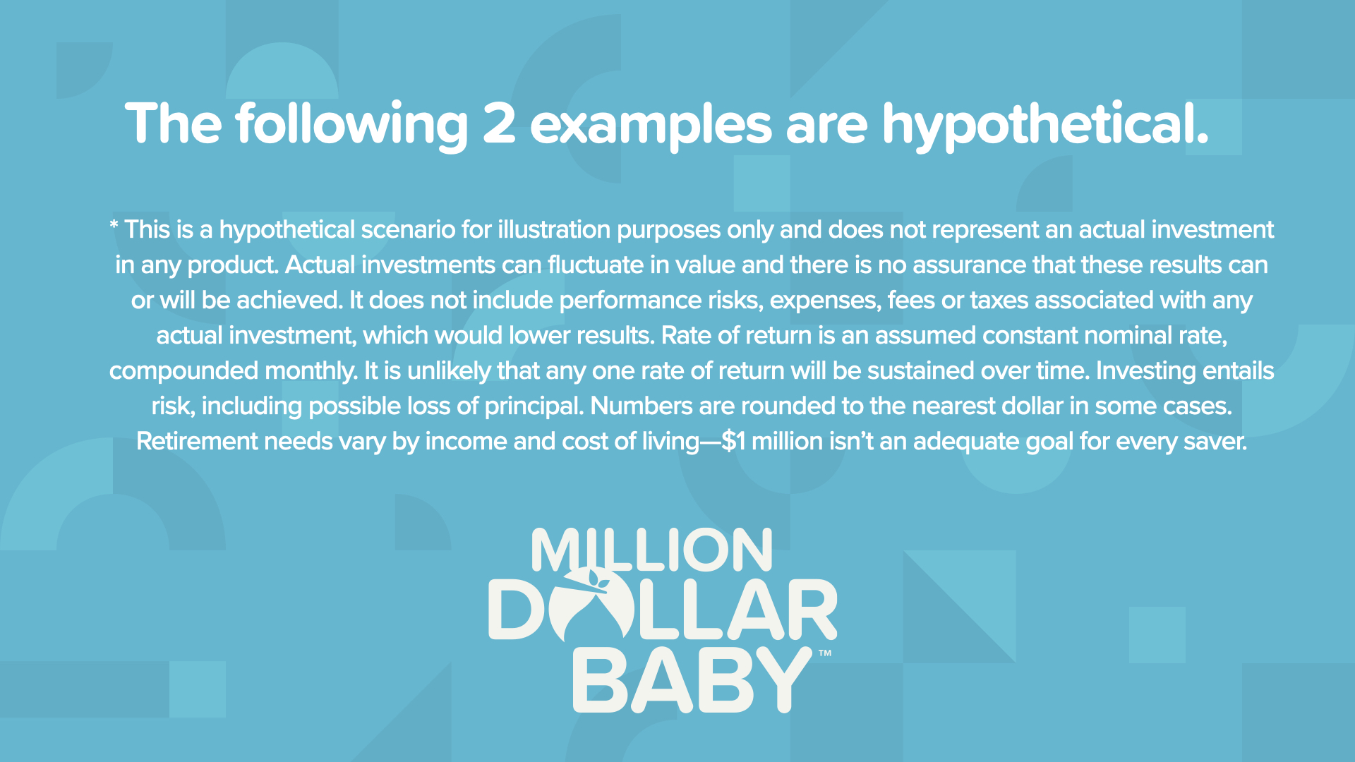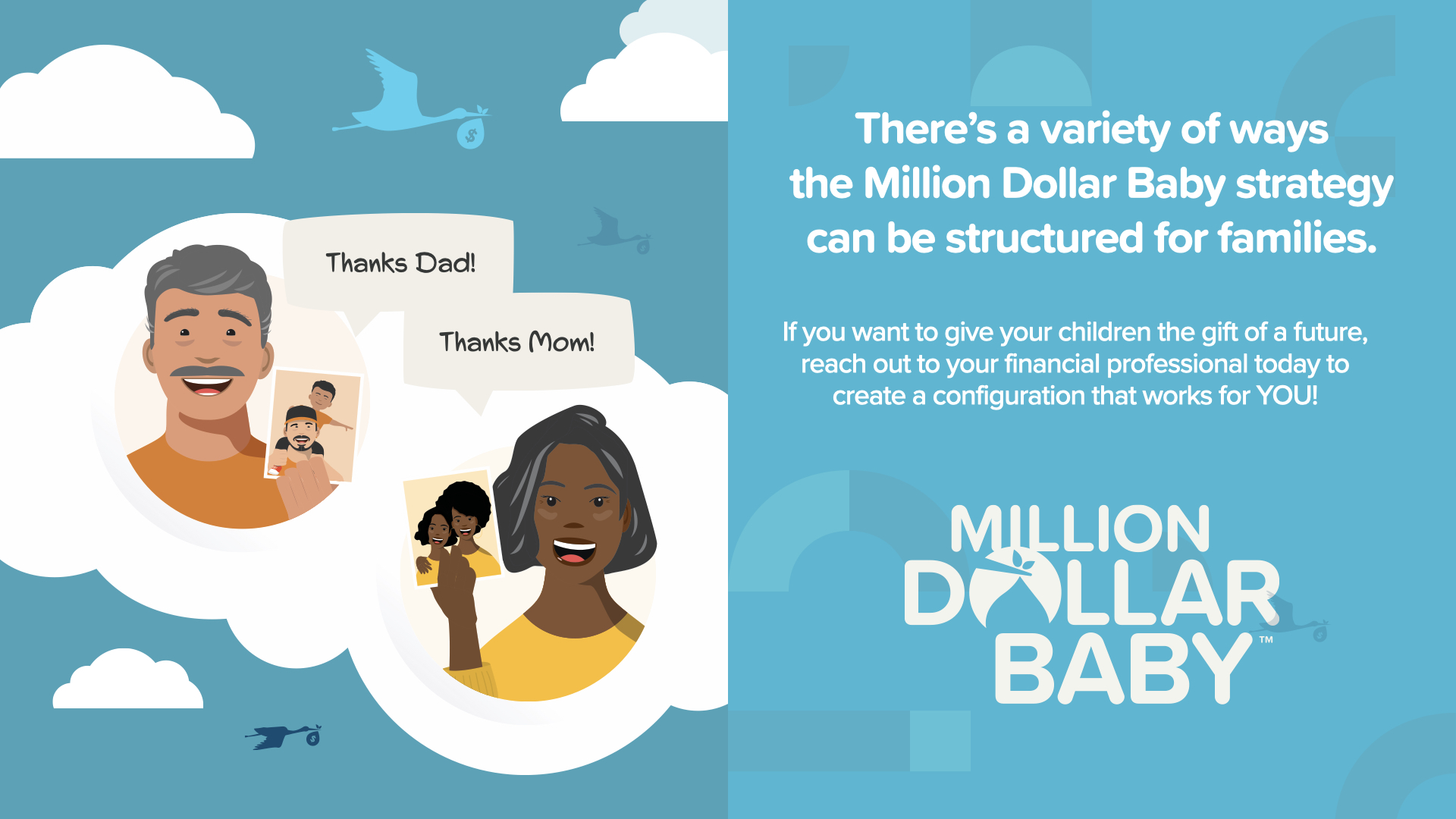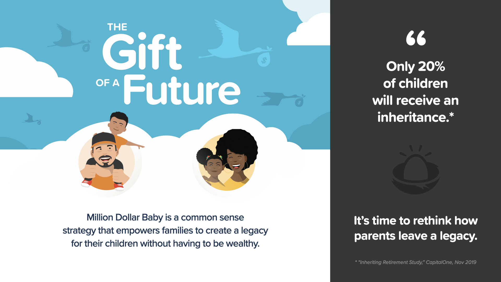 Now, let’s look at an example of something most parents dream about. If you have children—or plan to have children—you always want them to have it better than you. That’s natural. This example is a reimagining of how parents can leave a legacy for their kids. It’s a strategy that applies the Power of Compound Interest and the Time Value of Money in a way that makes the traditional end of life wealth transfer seem old fashioned and unnecessary. We call it, Million Dollar Baby.