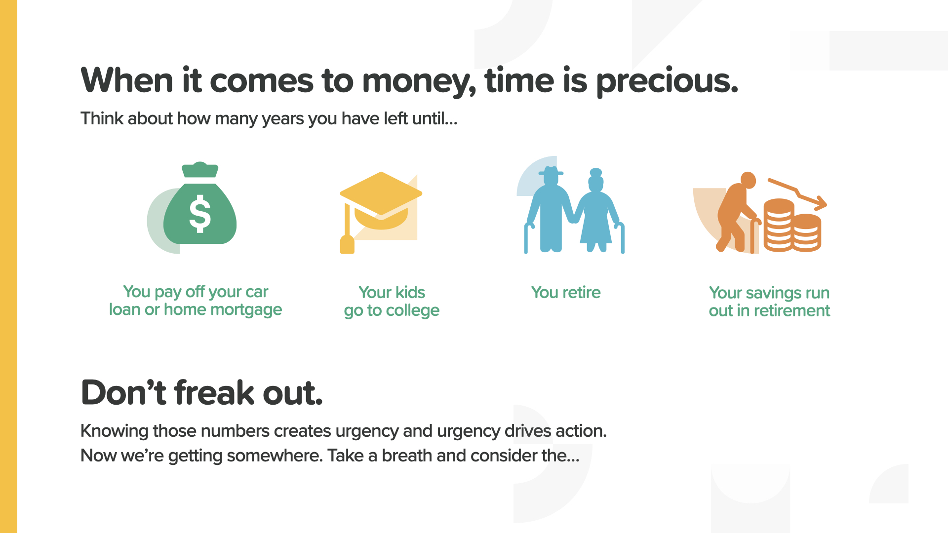 Time is one of our most precious commodities. How long do you have until you pay off your car or home? Or to send your kids to college? Or to retire? Or possibly to run out of money before you die? You need to know your numbers. Why? Because it forces us to value the time we have.