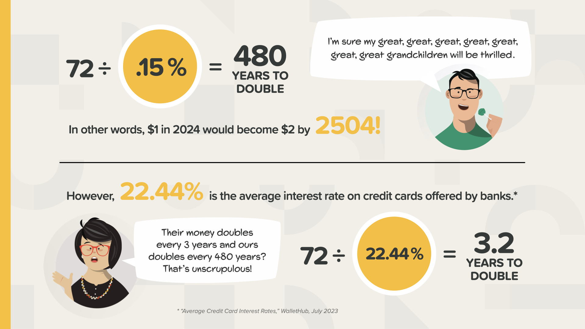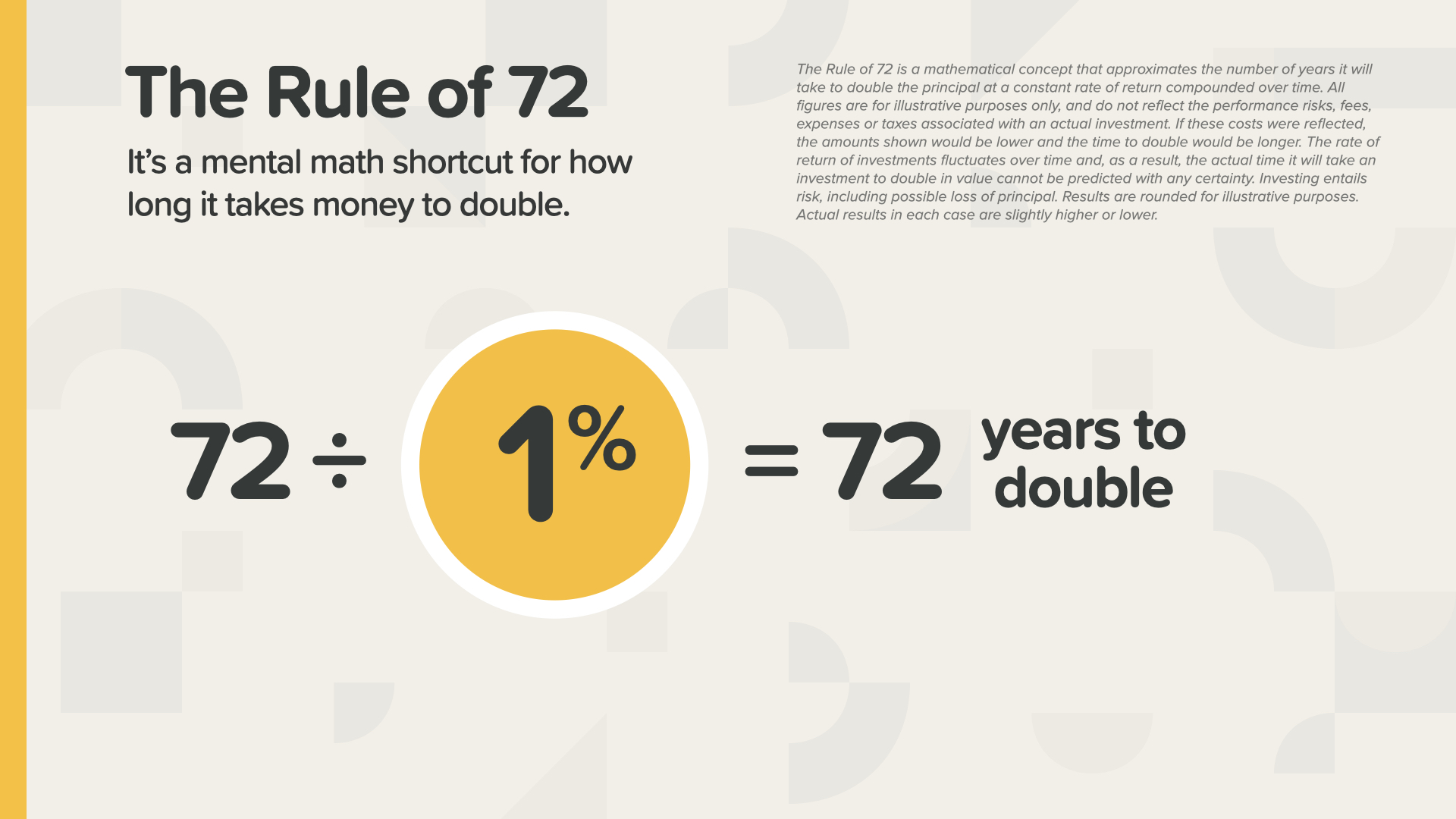 At 1%, it takes 72 years for $1 to turn into $2. That’s a long time. Would anyone knowingly choose that on purpose? Yet so many people choose rates that low, or even lower.