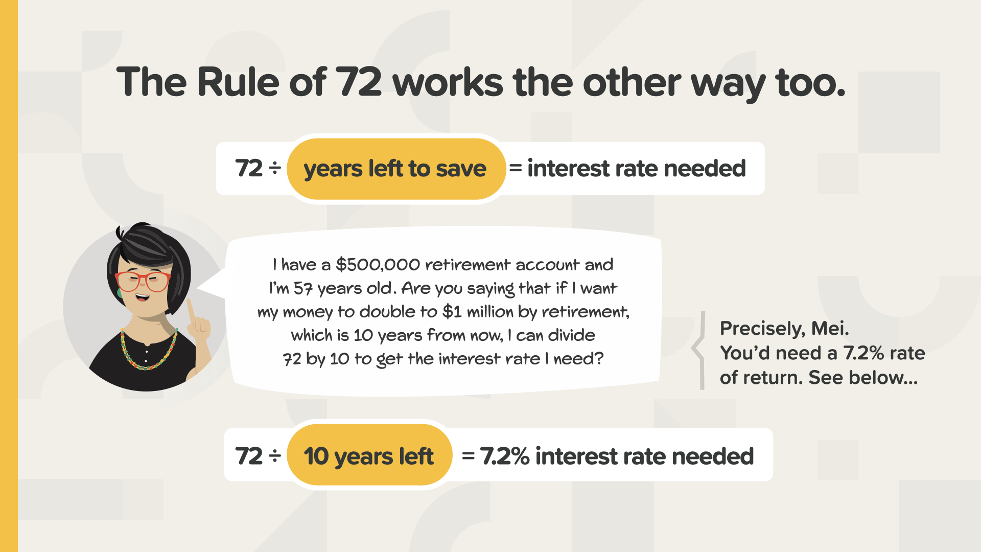 You can also use the Rule of 72 to figure out what rate of return you’ll need for a savings goal or what a loan will cost you.