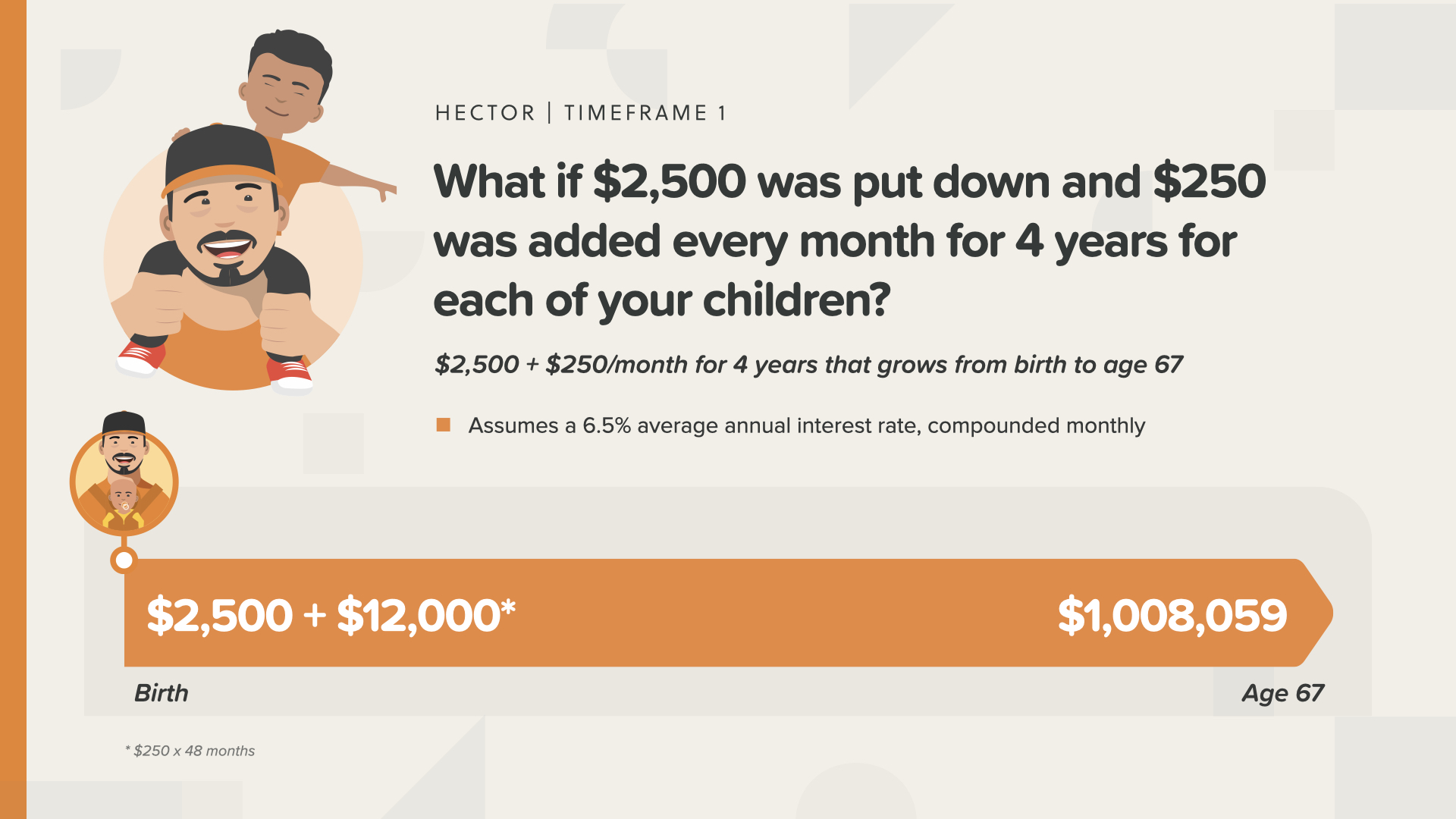 Hector doesn’t have $13,000 sitting around, but he still wants his son to retire with $1 million. He and his relatives can work together to save just $2,500 now and then $250 each month for the next 4 years. Then like magic, they’ll hit the goal too—his son also retires with $1 million waiting for him.