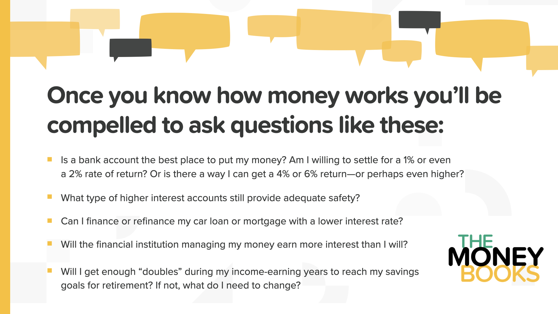We’re at the conclusion of today’s course. Principles like you just learned will bring up questions like the ones you see on the screen here. Should you use a bank account? What are other safer options? Should you refinance a loan at a lower rate? What can you do to help make more doubles possible? A financial professional is the best person to turn to for questions like these and others. We can discuss this with you if you don’t have one or need help choosing one.
