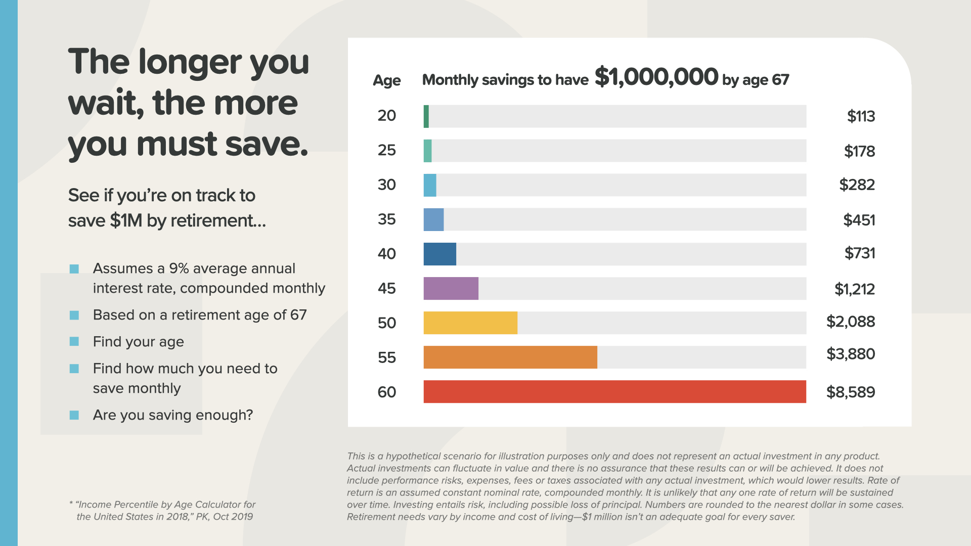 Now might be a good time to start applying these principles for yourself and see what that looks like. Write down your age and how much you need to save from the previous slide. What happens if you wait 5 years? How fast have the last 5 years flown by? Everyone needs to know this information now because time is ticking away.