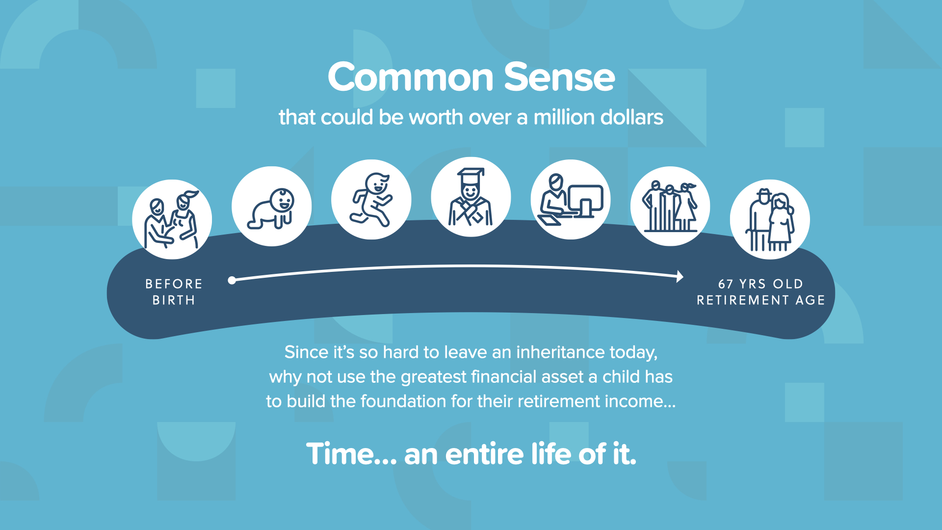 If you want to give your children $1 million at their retirement, which is more likely? You either give them each $1 million in cash when they’re adults and you’ve saved enough—or—you develop a plan to save a fraction of that amount for each child when they’re young.
