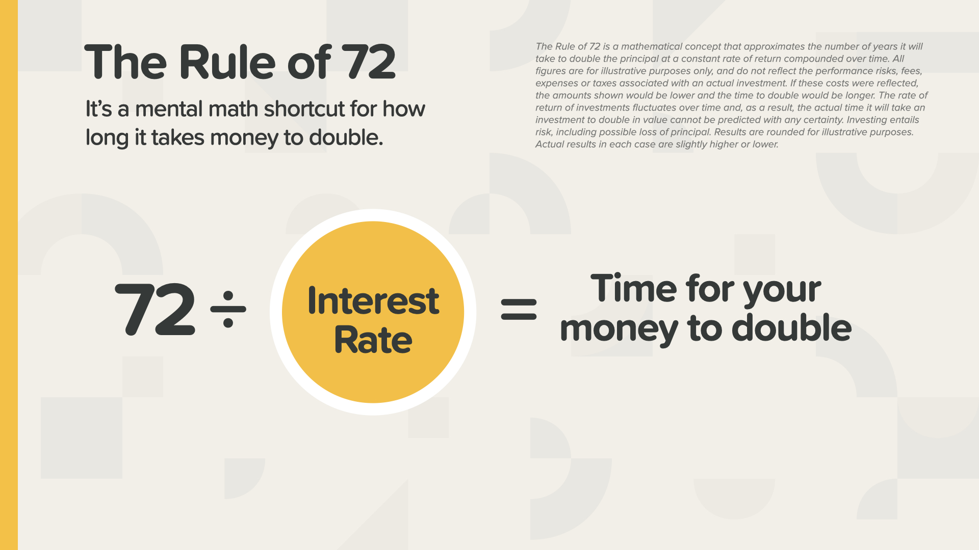 Are you having fun? We’re closing in on today’s class. Now, my favorite part. It’s time to learn the Rule of 72. Have any of you ever heard of it before? It’s a little known mental math shortcut that the wealthy have used for years. Everyone should know it.