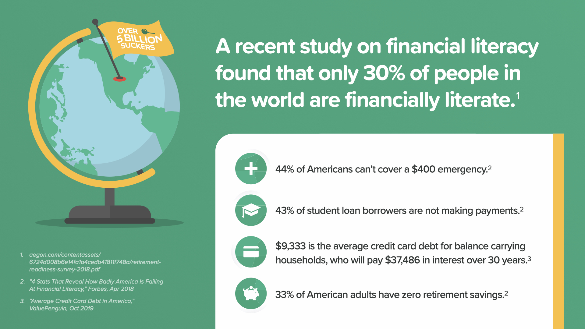 Financial illiteracy is the #1 economic crisis in the world. We know the word ‘sucker’ sounds insulting. Unfortunately, that’s the best way to describe someone who can be taken advantage of because they don’t know how things work. And not knowing how money works does suck. It can suck up your time, suck up your freedom, and even suck up your income. Now that sucks!