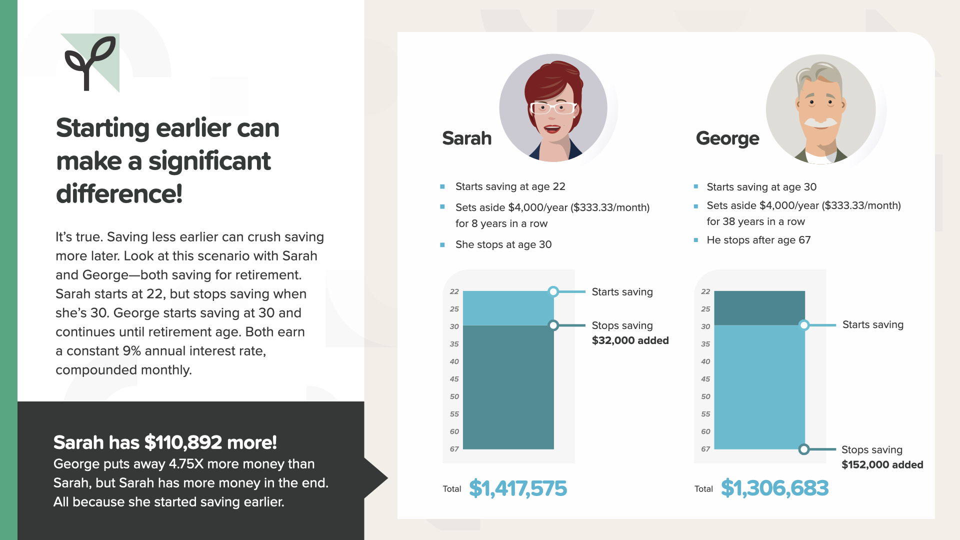 Starting earlier is always a good idea. It can make a significant difference. In this case, saving from age 22-30 is better than from age 30-67. Here, Sarah ended up with $110,892 more after putting away 4.75x less money.