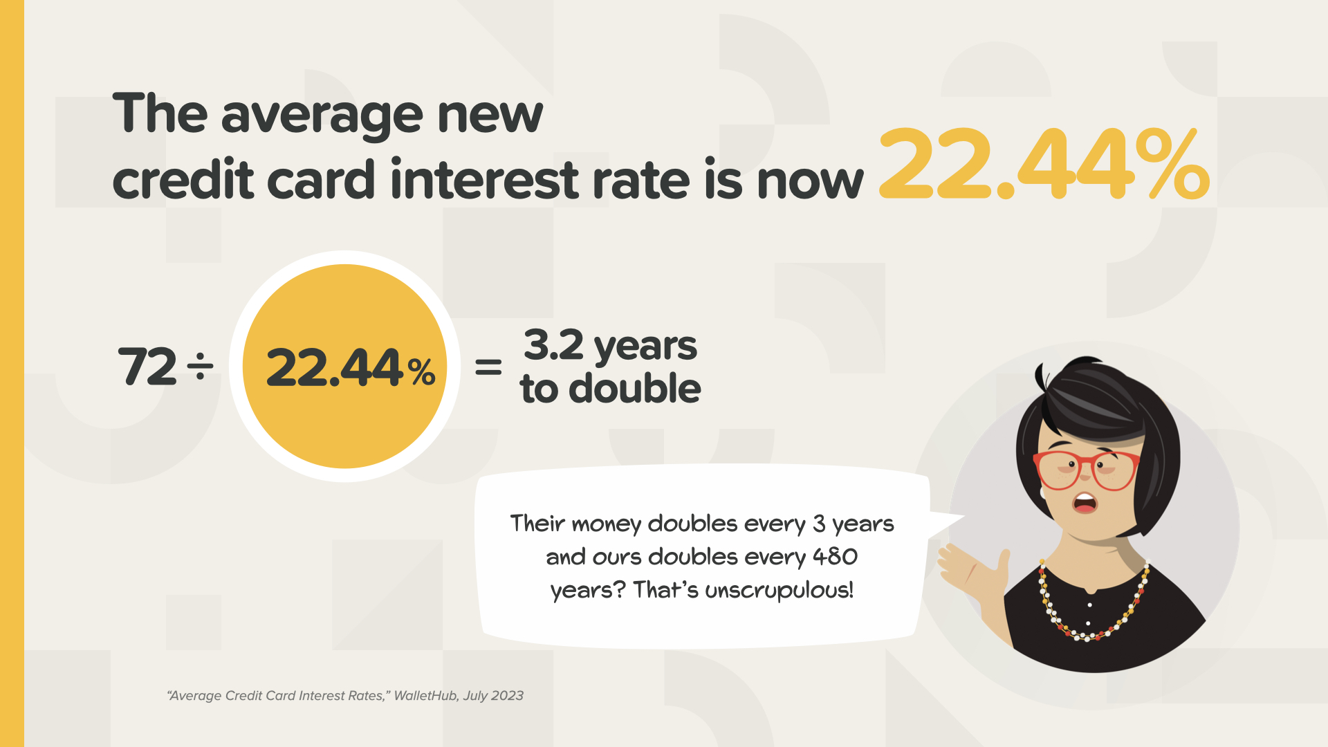 Are you having fun? This is my favorite part. It’s time to learn the Rule of 72. Have any of you ever heard of it before? It’s a little known mental math shortcut that the wealthy have used for years. Everyone should know it. You simply divide any interest rate into the number 72 and it tells you how long it takes for your money to double. It works FOR you if you save money. It works AGAINST you if you borrow money. At 1%, it takes 72 years for $1 to turn into $2. That’s a long time. Would anyone knowingly choose that on purpose? Yet so many people choose rates that low, or even lower.