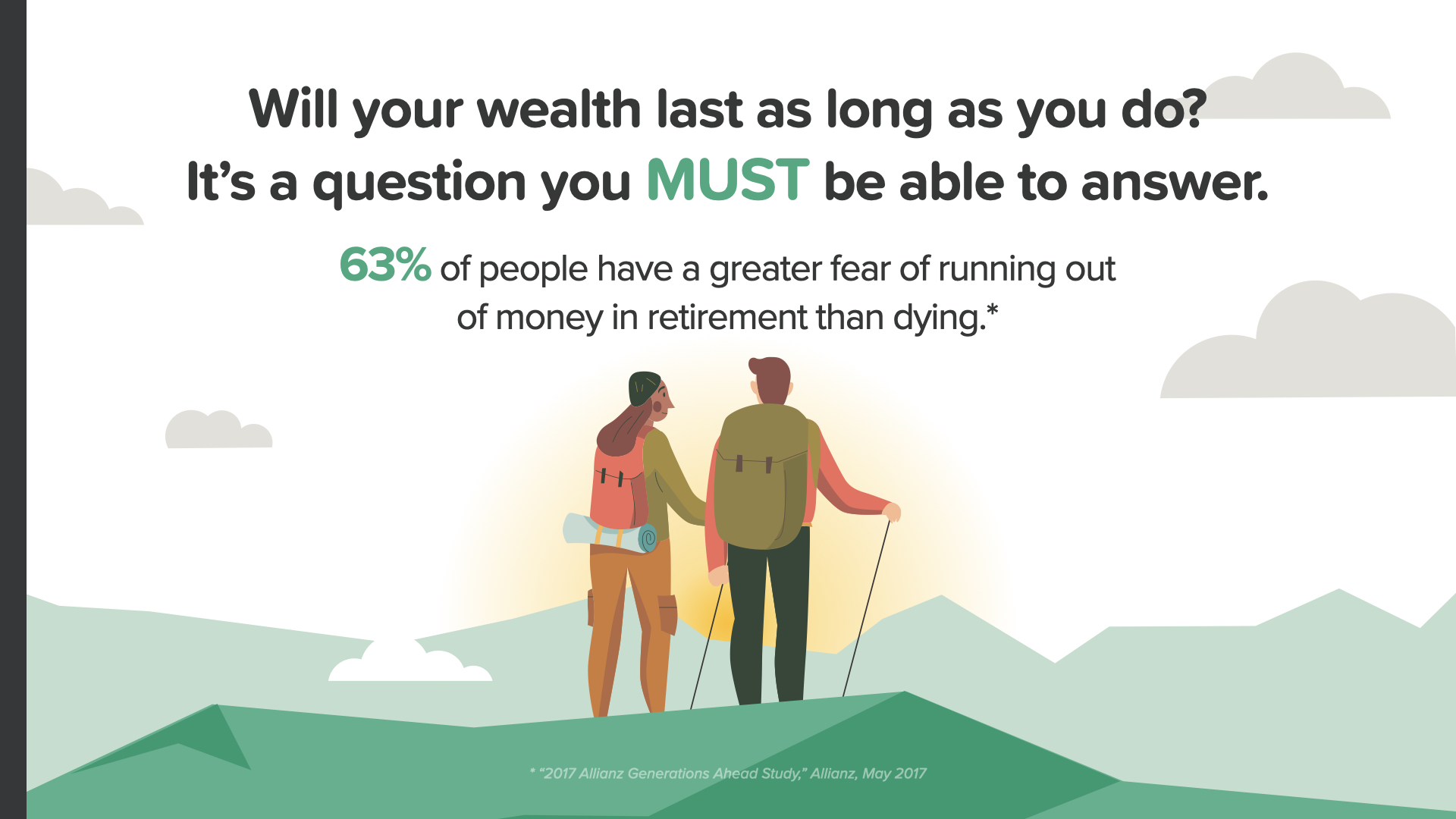 With the possibility of longevity adding so many years to your life, that brings up one question. Will your wealth last as long as you do? You have to be able to answer that question.