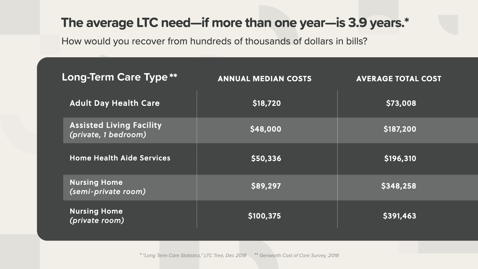 AND if you do… the average long-term care need—if more than one year—lasts 3.9 years. As you can see here, the average total cost can be a crippling expense if not covered by a policy. The cost without LTC coverage could drain one or more of your savings assets you were counting on for the future.