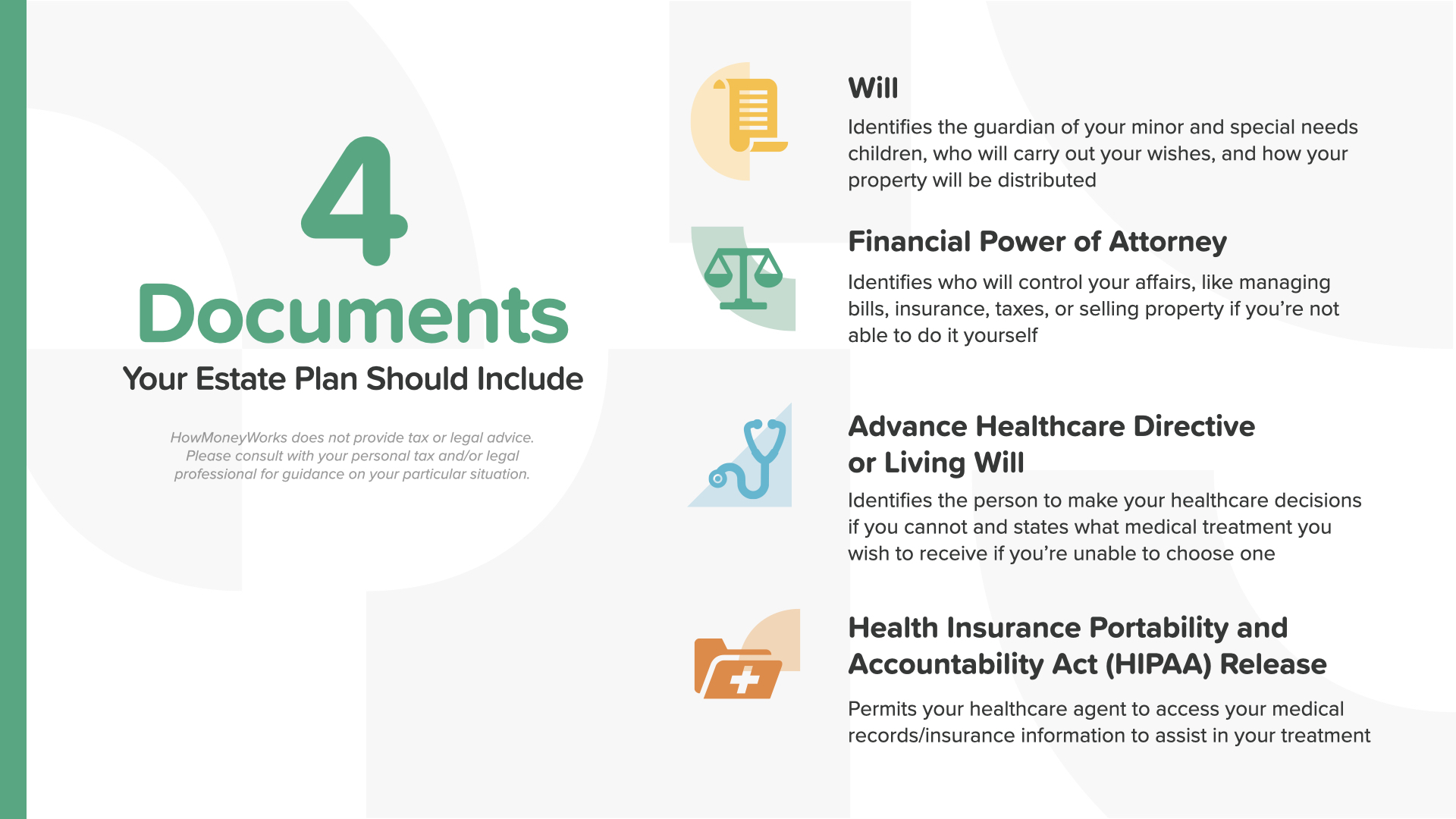 There are 4 documents your estate plan should include. You’ll need a will, your financial power of attorney, an advance healthcare directive or living will, and a HIPAA Release. Your legal professional can help you put these in place.