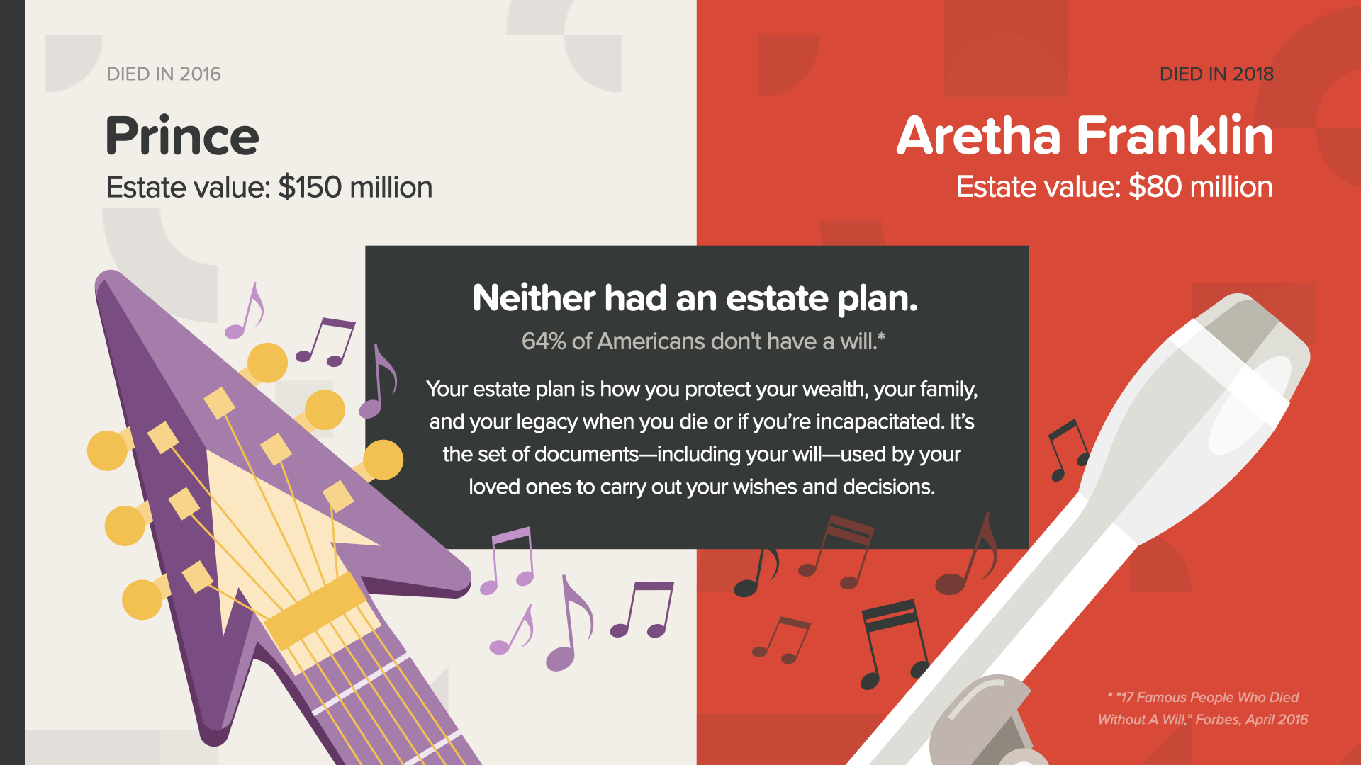 Prince and Aretha Franklin had sizable estates—but neither had an estate plan. Both left their families and business partners with an emotional, financial, and legal mess taking years to sort out. This shows how important it is to protect your wealth with an estate plan. According to a RocketLaw survey, 64% of Americans don't have a will. Not surprisingly, the number of people without a will is higher for younger Americans—70% of those aged 45-54—than for older Americans—54% of those aged 55-64. Prince was only 57. Your estate plan is how you protect your wealth, your family, and your legacy when you die or if you’re incapacitated—it’s how your wishes and decisions will be carried out.