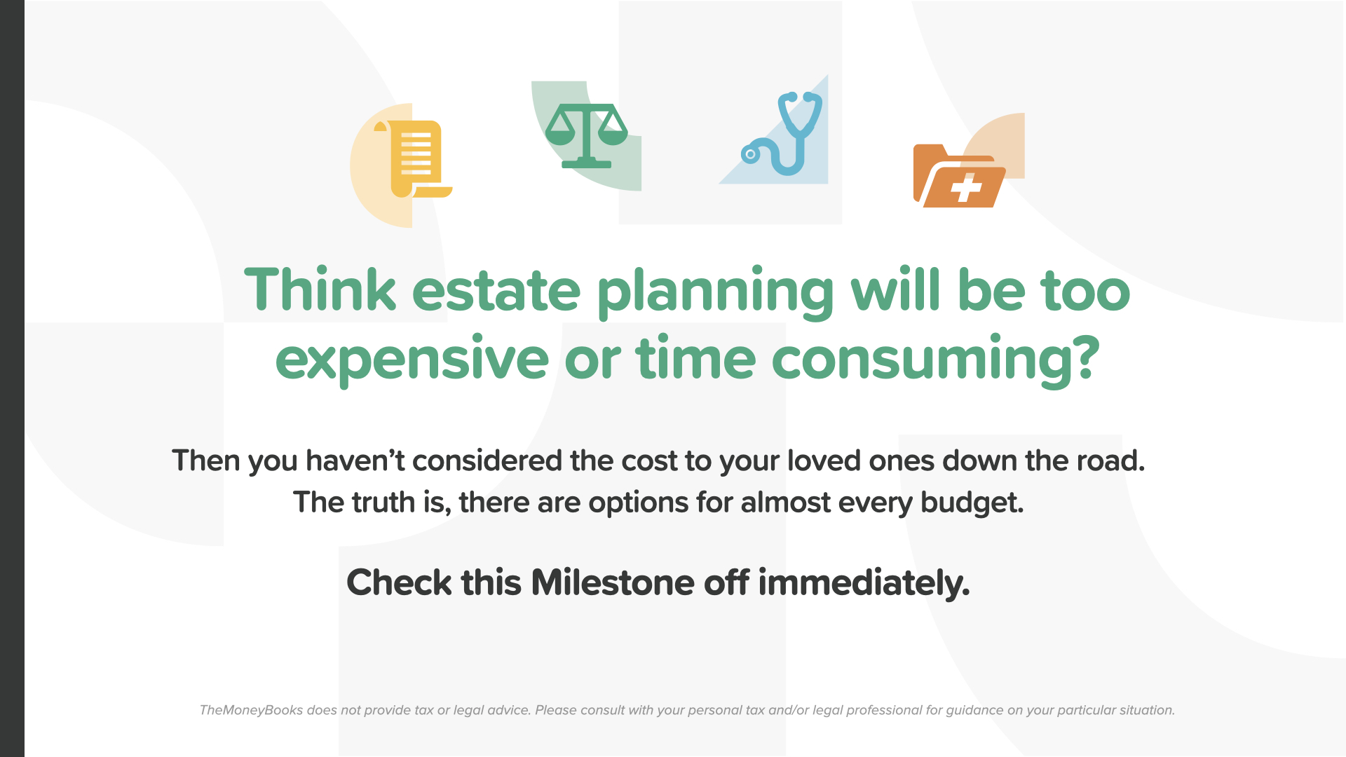 If you think estate planning will be too expensive or time consuming, then you haven’t considered the cost to your loved ones down the road. The truth is, there are options for almost every budget. We recommend you put this Milestone in place right away.