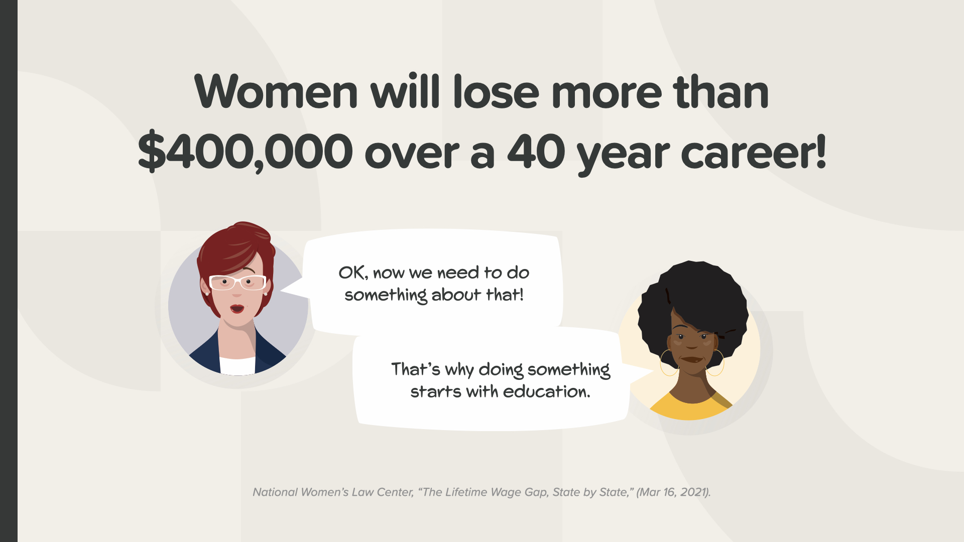 Over a 40 year career, the gender pay gap ends up costing us more than $400,000. That’s $400,000 less that we had to pay off debt. And, that’s $400,000 less that we had to save for retirement or other financial goals.
