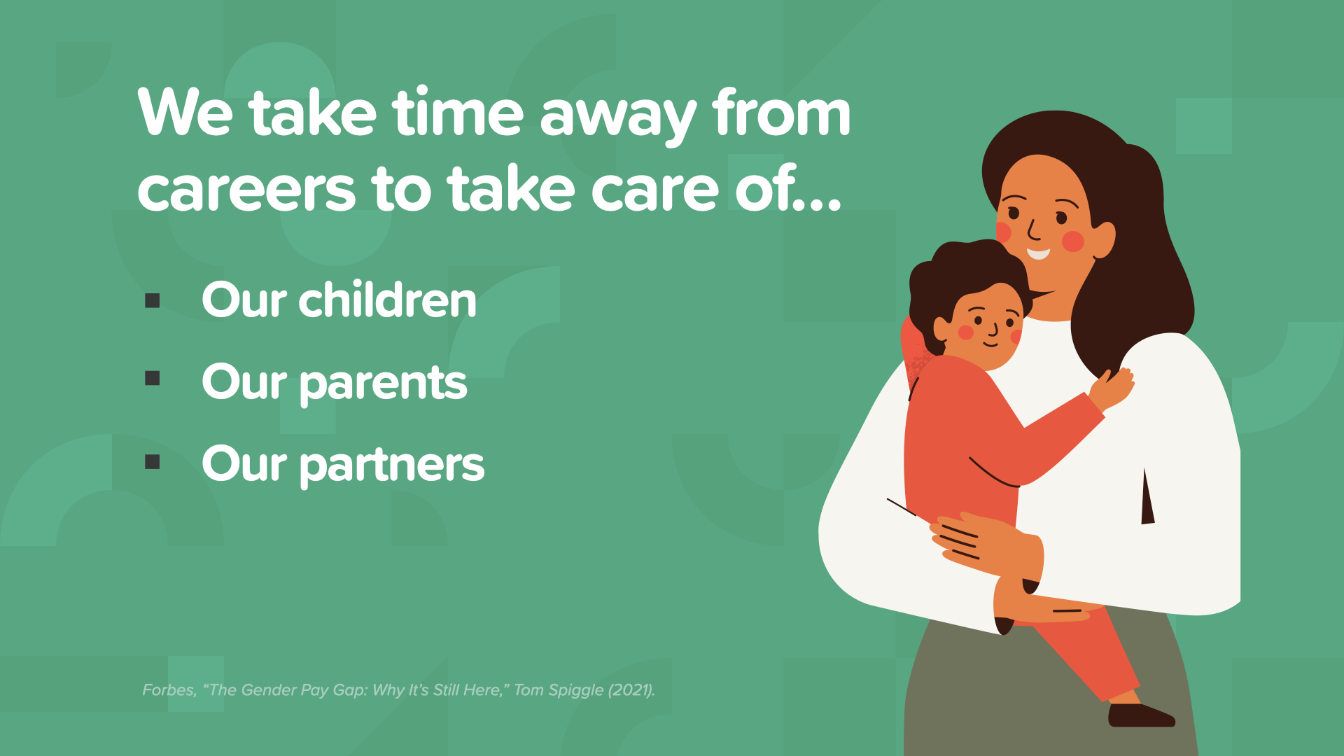 The primary reason for this is that we take days off work or time away from our careers to raise our children, or take care of our aging parents or a sick partner. These interruptions in our career can significantly impact our chances for promotions, our ability to earn higher income levels and for some women, vesting in full retirement benefits.
