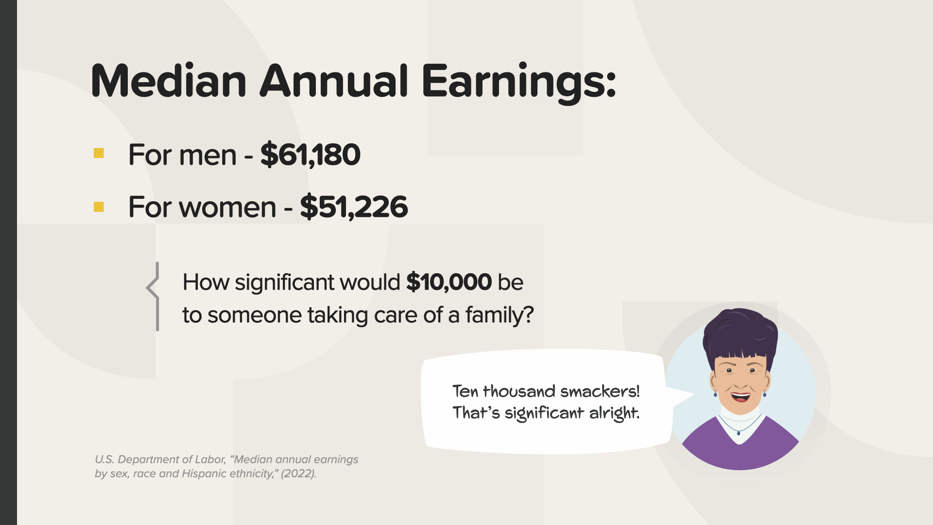 Let’s consider median annual earnings. Men earn more than $61,000. At 82 cents for every $1 earned by a man, the median annual earnings for women is a little more than $51,000. For someone taking care of a family, how significant do you think that extra $10,000 would be? For a single mom, that could be everything.
