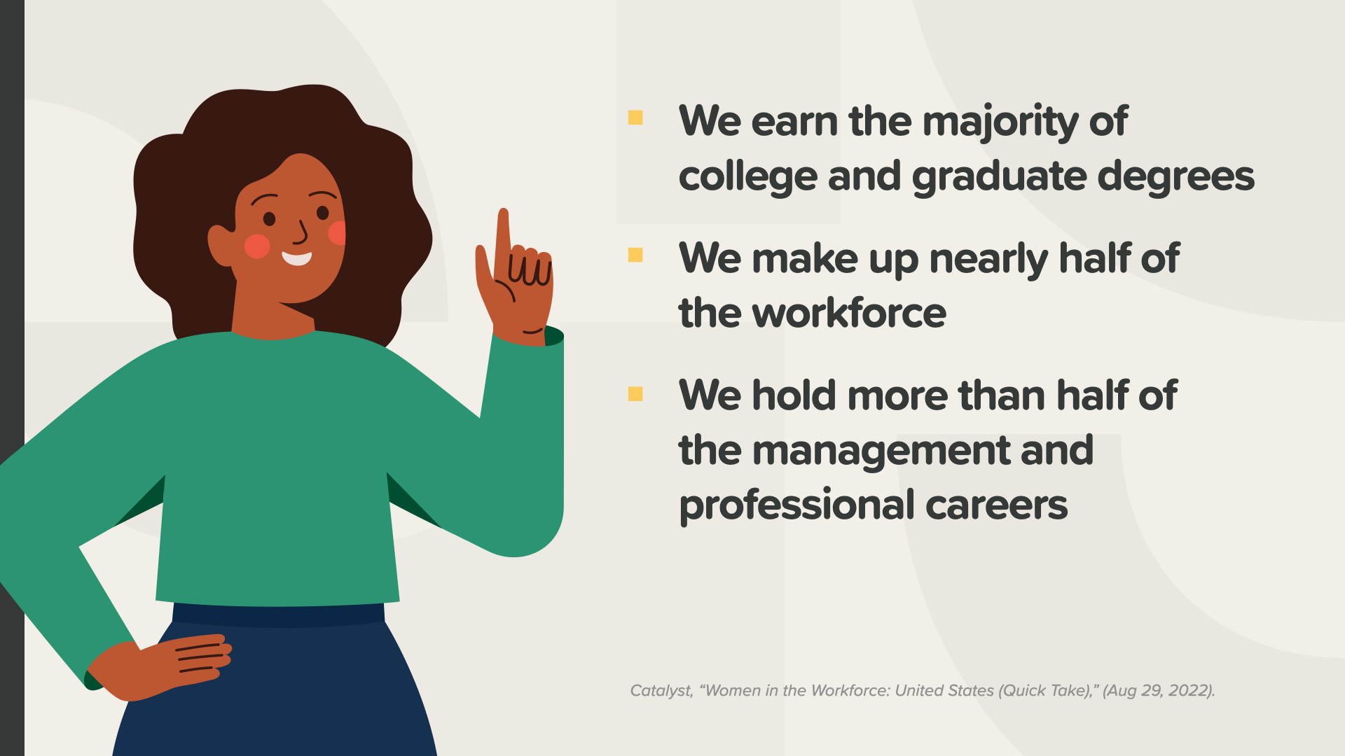We’ve made a lot of progress in the workplace and academically. We earn the majority of college degrees, we make up nearly half of the workforce, and we represent more than half of the management and professional careers.
