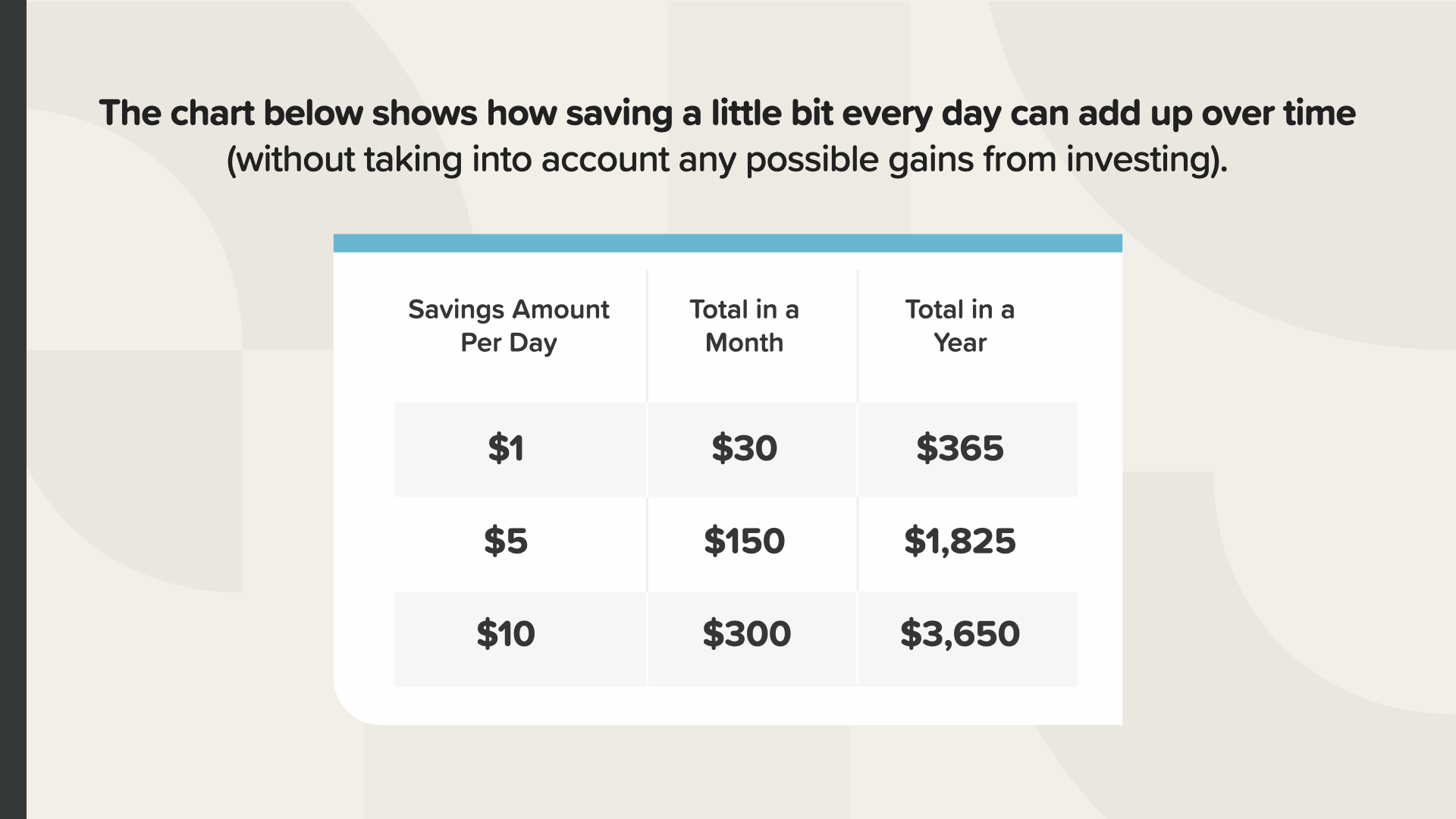 You can actually start with a small amount. If you save $1 a day, you’ll have $30 in a month and $365 in a year. If you save $10 a day, you’ll have $300 by the end of the month and $3,650 at the end of the year. By taking these small steps, and applying financial principles like compound interest and the time value of money, your savings have the potential to grow exponentially over time to help you reach your goals.