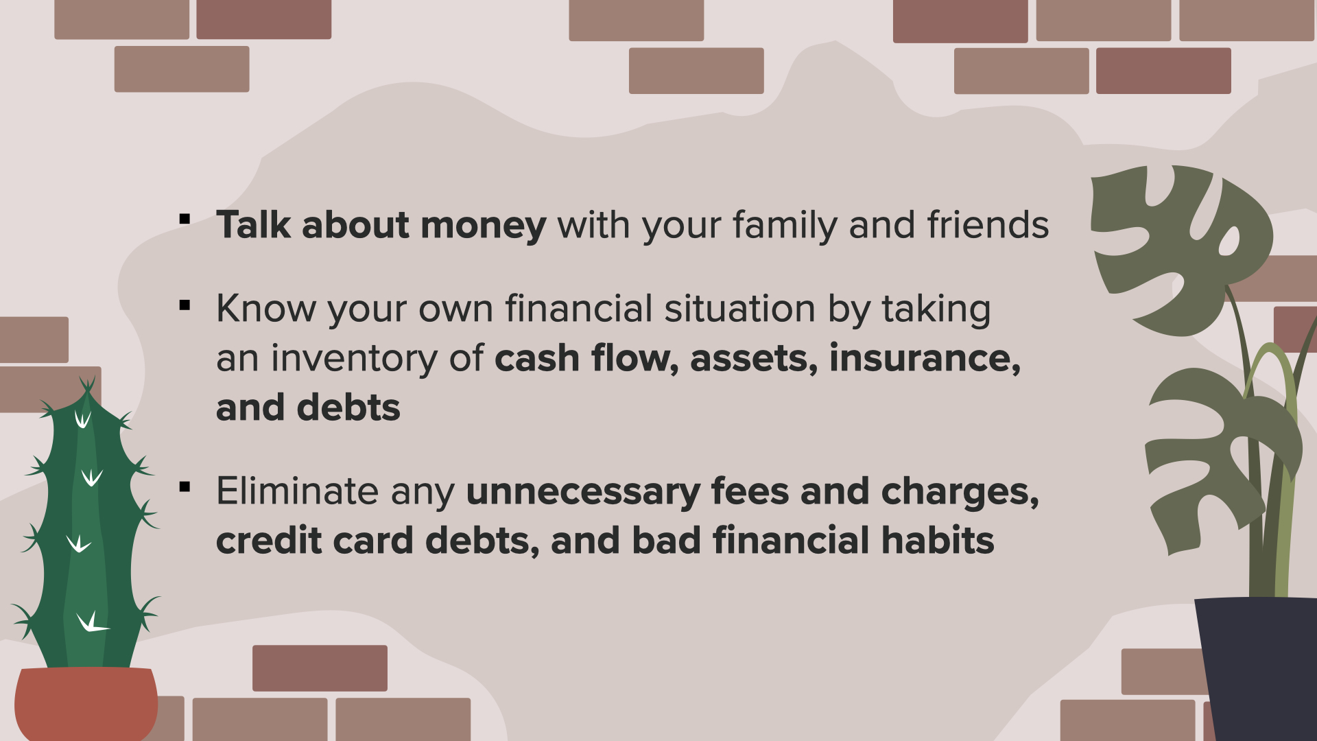 The last thing to consider eliminating are any bad financial habits. My bad financial habit is (the speaker should give a personal story about her own bad financial habit like $5 lattes, online shopping, etc.). What bad financial habits can you eliminate to add more money to your bank account over time?
