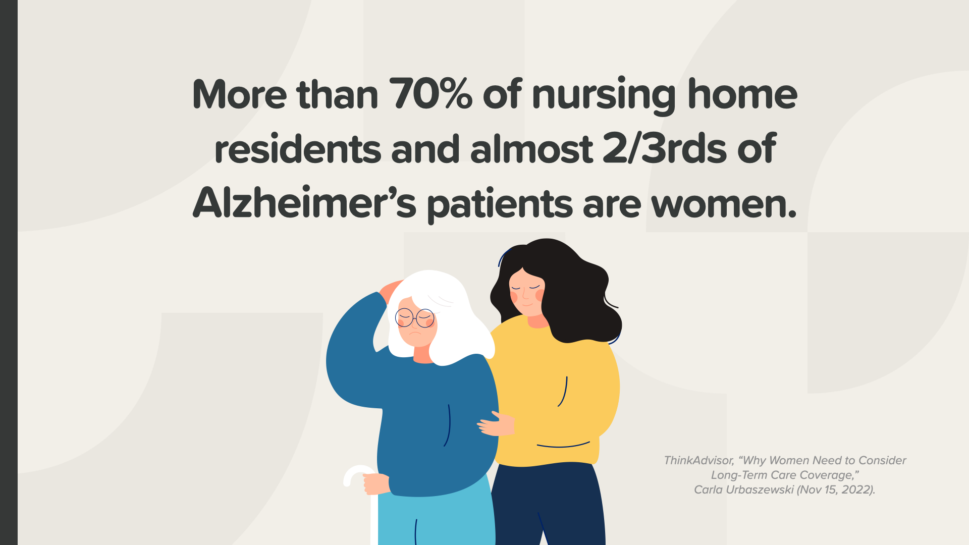 It’s critical that we do long-term planning because many women end up in nursing homes and/or with Alzheimer’s. You may think that it won’t be you, but if it’s not you, then it’s your mother, your sister, your aunt, your best friend. If it’s not you, it will be someone you care about or care for. Be the example for the women in your life about planning for the future.