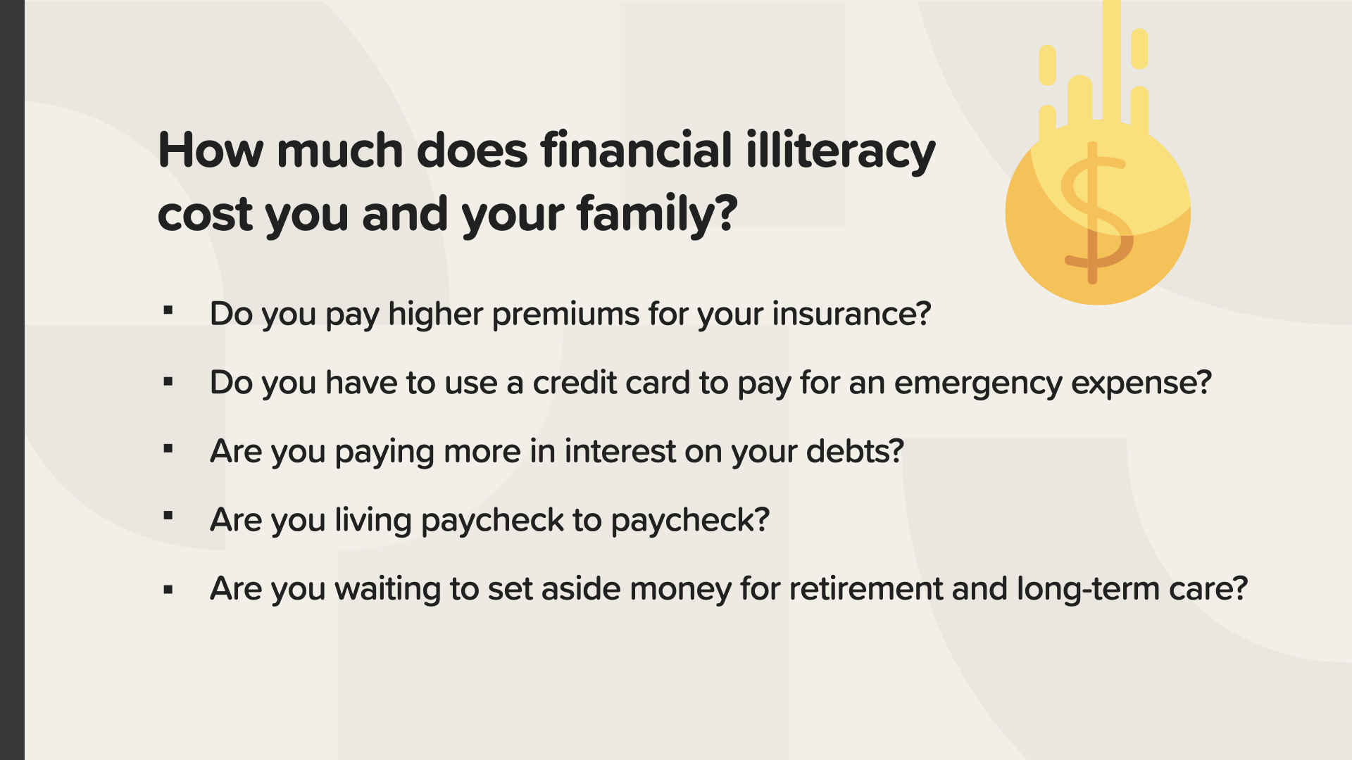 Not knowing how money works will cost you and your family. In 2022, financial illiteracy cost the average American adult $1,819.* How much does it cost you and your family?