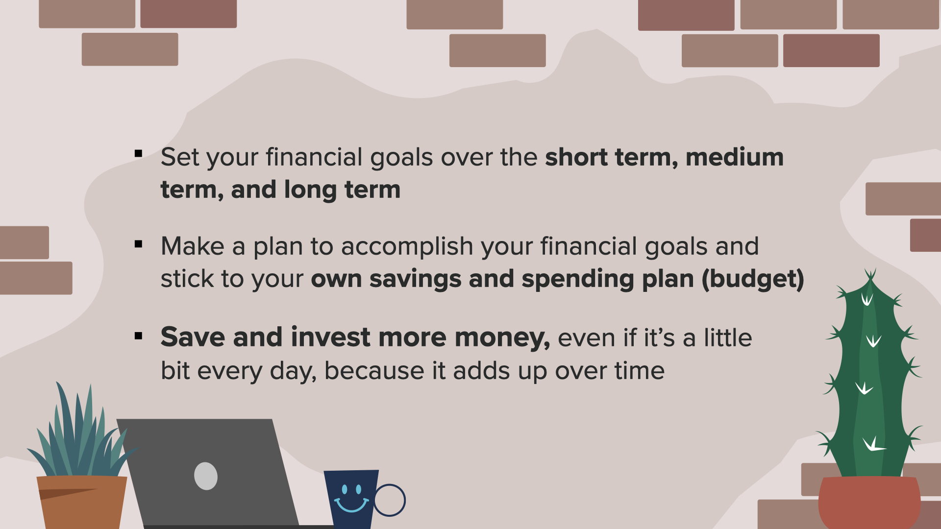 Think about your goals in terms of time frames. We are very good at setting goals for the short-term, but we also need to identify our goals for the medium-term, like buying a house or a bigger house or maybe going on a dream vacation, and for the long-term, like our retirement and long-term care needs.