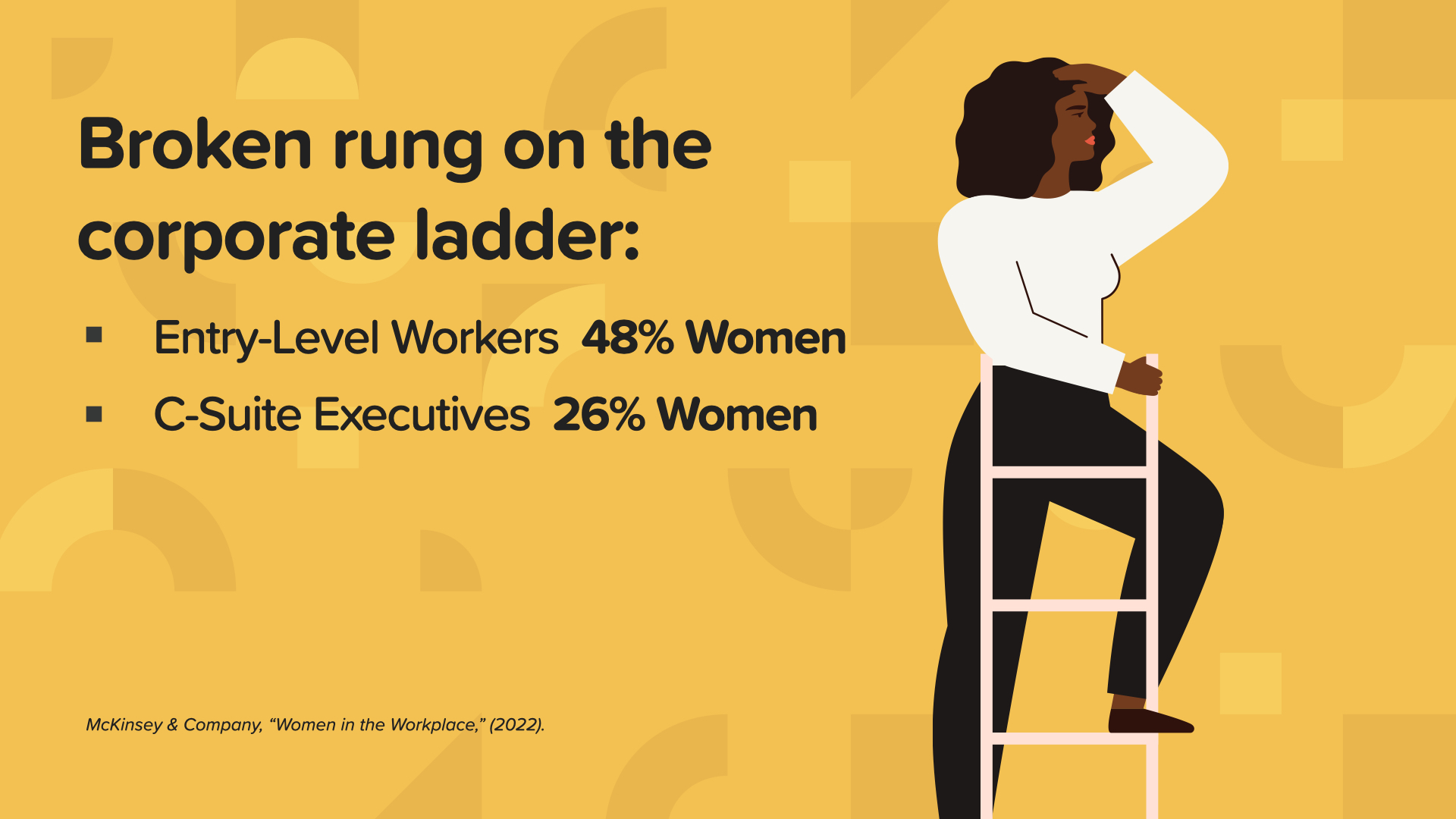 And women who pursue better corporate career opportunities find there’s a broken rung on the ladder. We represent 48% of entry-level workers, but only 26% of executives in the C-suite.