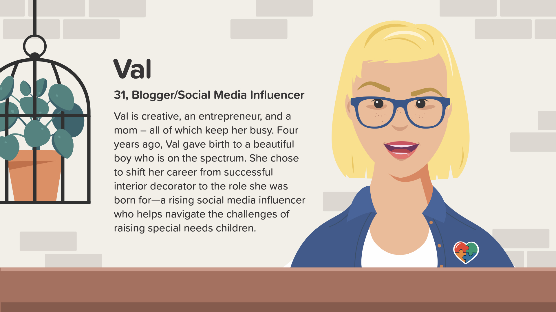 Val is a 31 year old social media influencer and blogger. When her son was diagnosed with autism, she changed careers so she could work from home helping other parents of special needs children. Val is most concerned with how to plan for her and her son’s future financial needs.