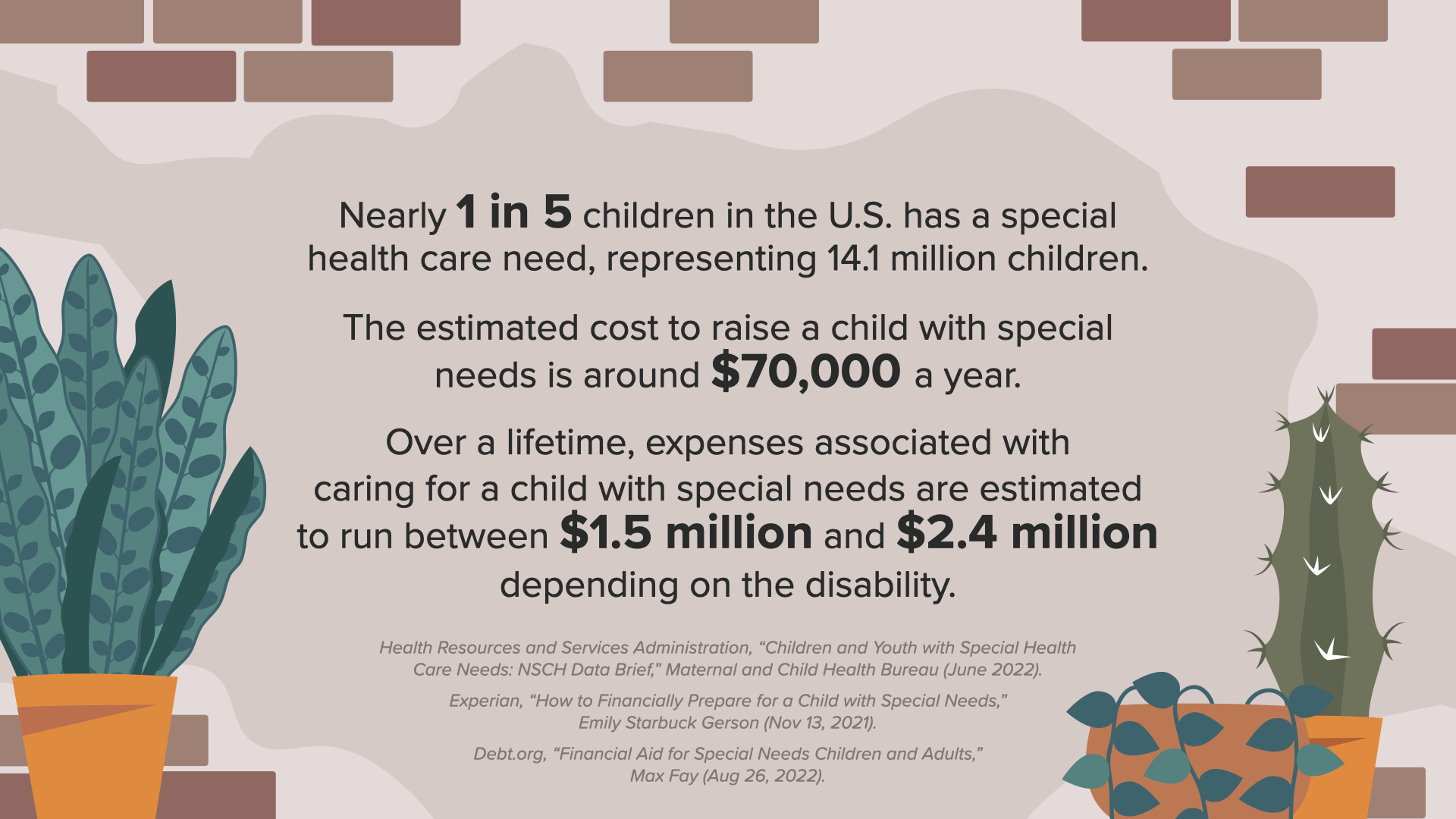 Nearly 1 in 5 children in the U.S. has a special health care need. The estimated cost to raise a child with special needs is around $70,000 a year. Over a lifetime, the costs to care for a child with special needs are estimated to run between $1.5 million to $2.4 million depending on the disability.