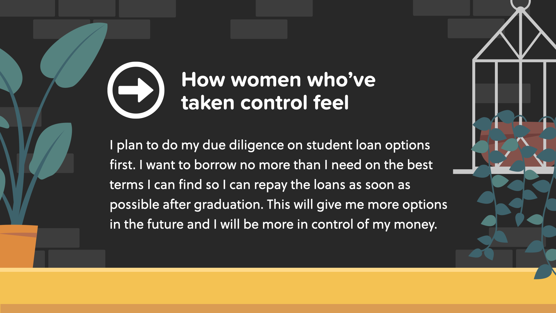 Zoey’s chapter includes a checklist on how to minimize student loan debt and tips on how to pay it off quickly. We want someone reading Zoey’s chapter to feel confident that she can do her own due diligence to select the right loan for her on the best terms and that she can repay the loans as soon as possible after graduation. This will give her more options in the future.