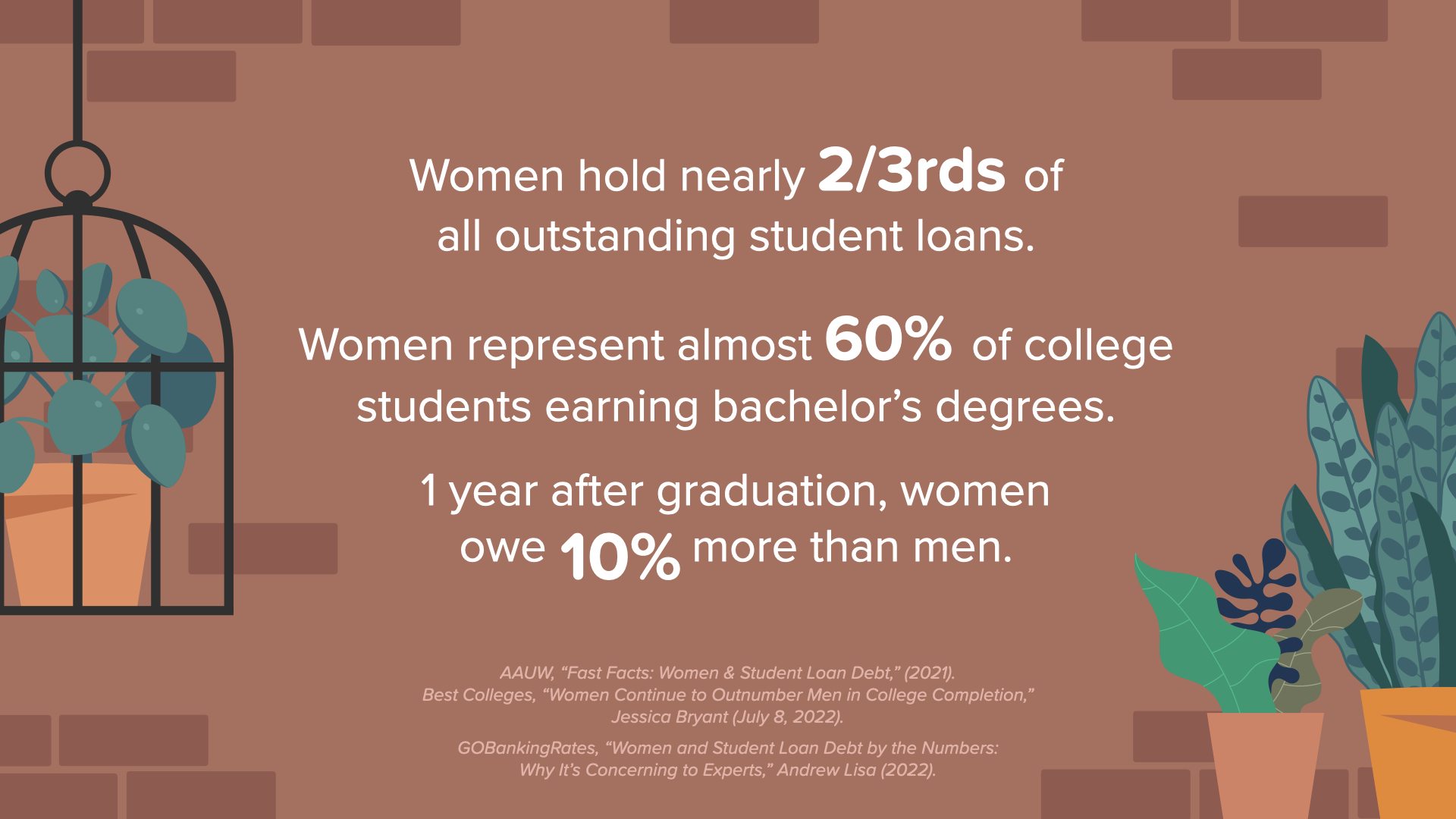 Why do you think that is? It’s that insidious gender pay gap. If we earn 82 cents for every dollar earned by a man, we have less money each month to pay off student loan debt.