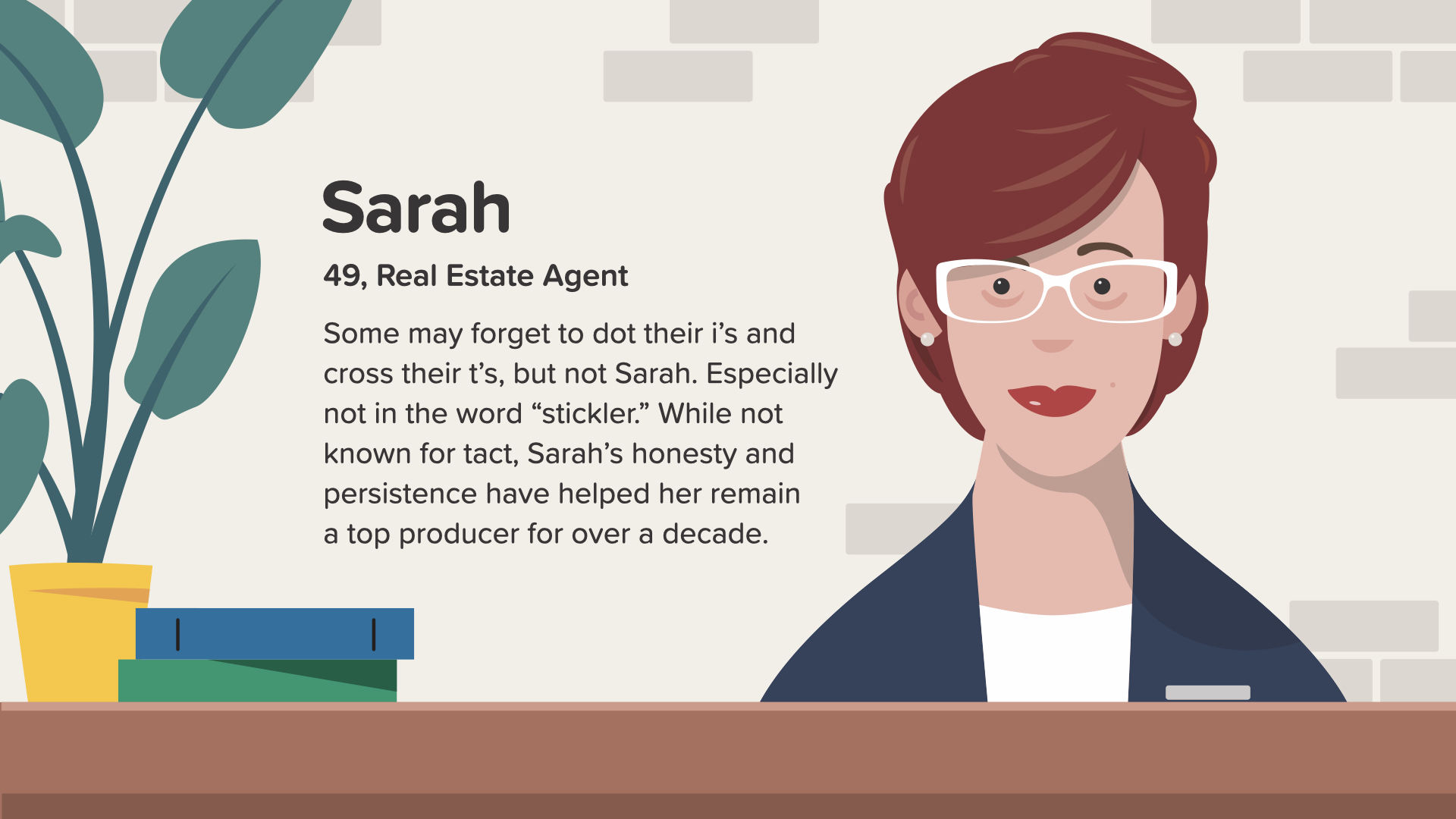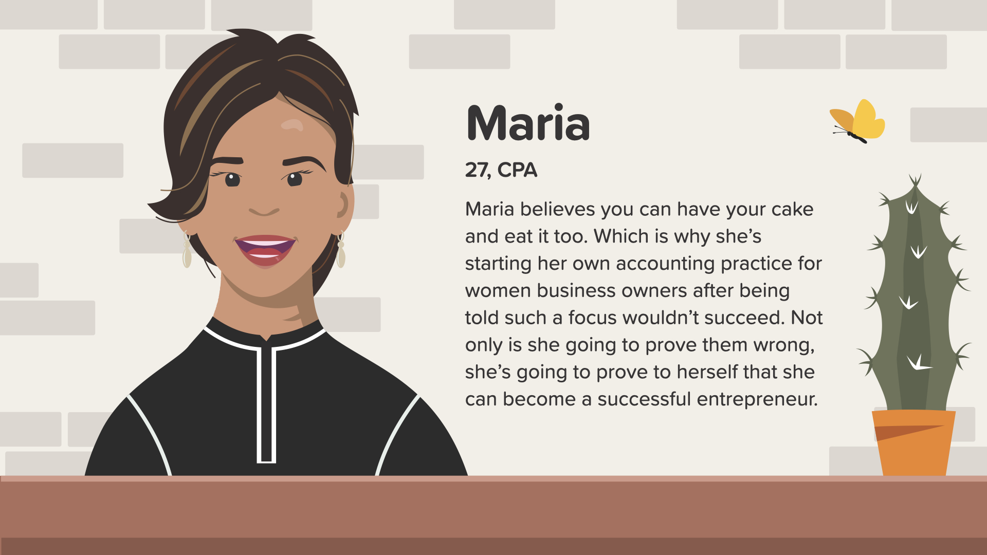 Our next character is Maria. She’s 27 and a CPA. Maria decided to start her own accounting firm, and she’s planning her wedding.