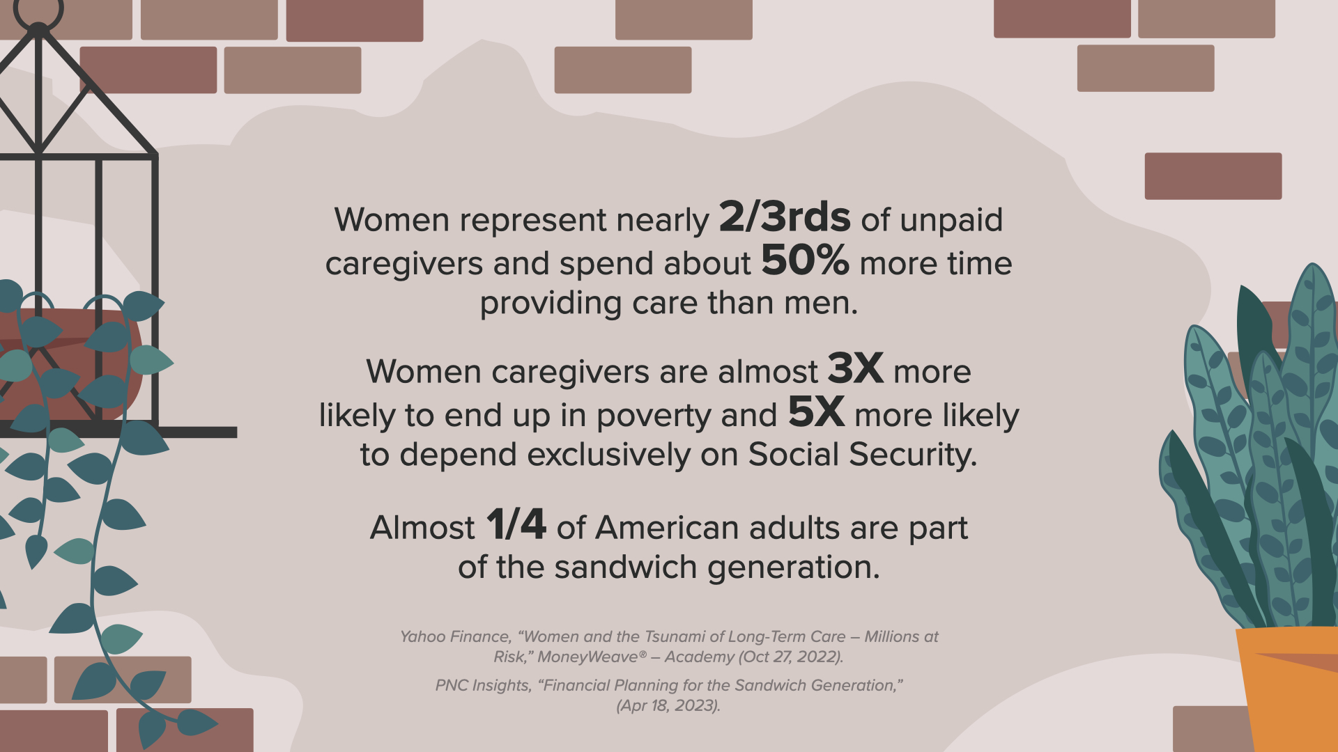 Women represent nearly 2/3rds of unpaid caregivers and spend about 50% more time providing care than men. Women caregivers are almost 3X more likely to end up in poverty and 5X more likely to depend exclusively on Social Security. Almost ¼ of American adults are part of the sandwich generation - taking care of aging parents and adult children.