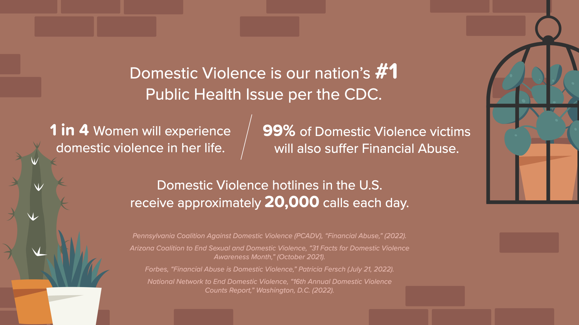 Domestic violence is this country’s #1 public health issue per the CDC. 1 in 4 women will experience domestic violence in her life. And, 99% of victims will also suffer financial abuse. Domestic violence hotlines in the U.S. receive approximately 20,000 calls each day. So, if we’re going to address women and finances, we have to talk about this important issue that affects at least 25% of women.