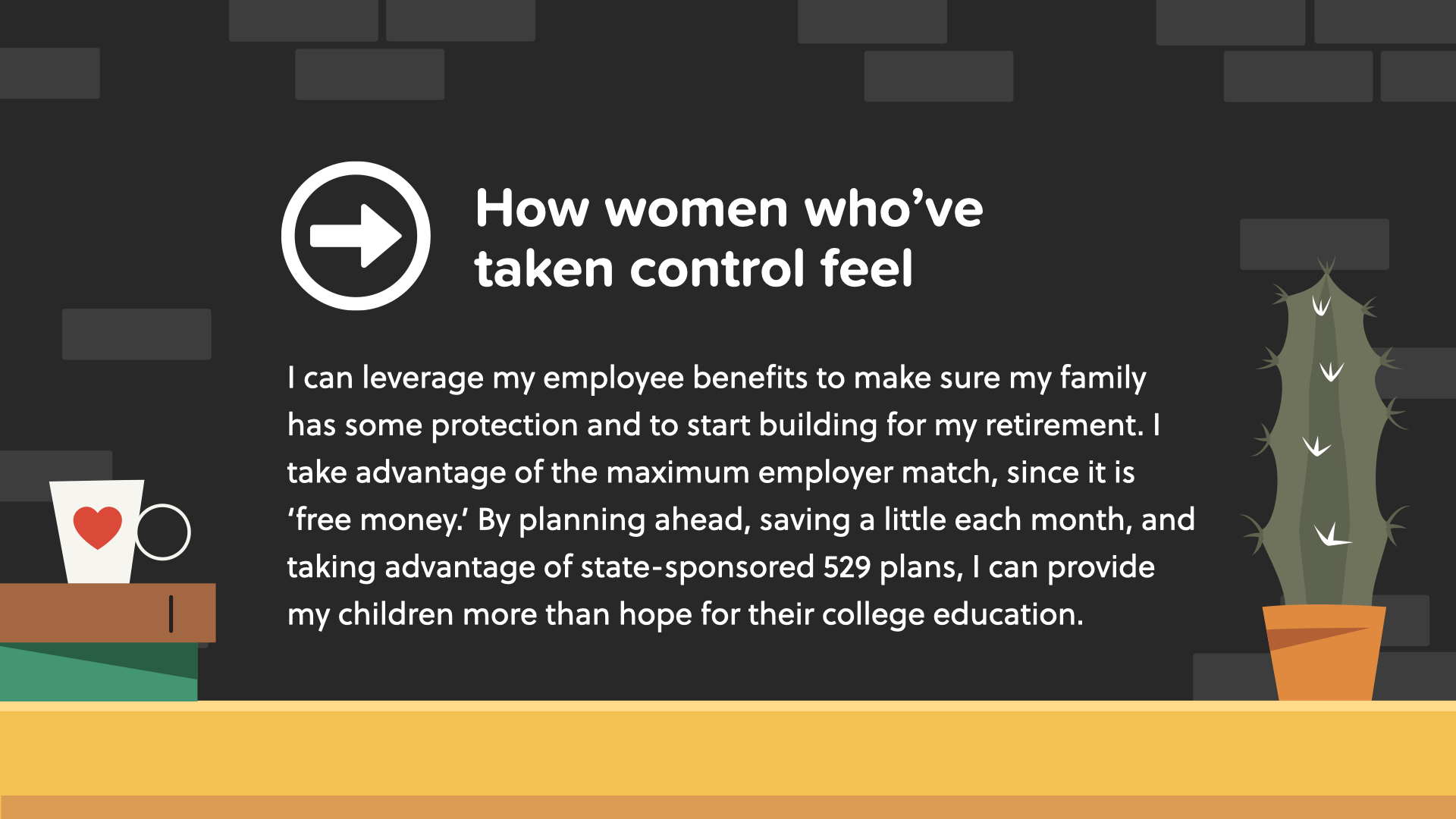 We want women who relate to this chapter to feel hopeful about taking back control by planning, stashing cash, and reaching out for help from family and community resources. Starting over will be hard in the short-term, but staying in the same situation will be much harder in the long-term.