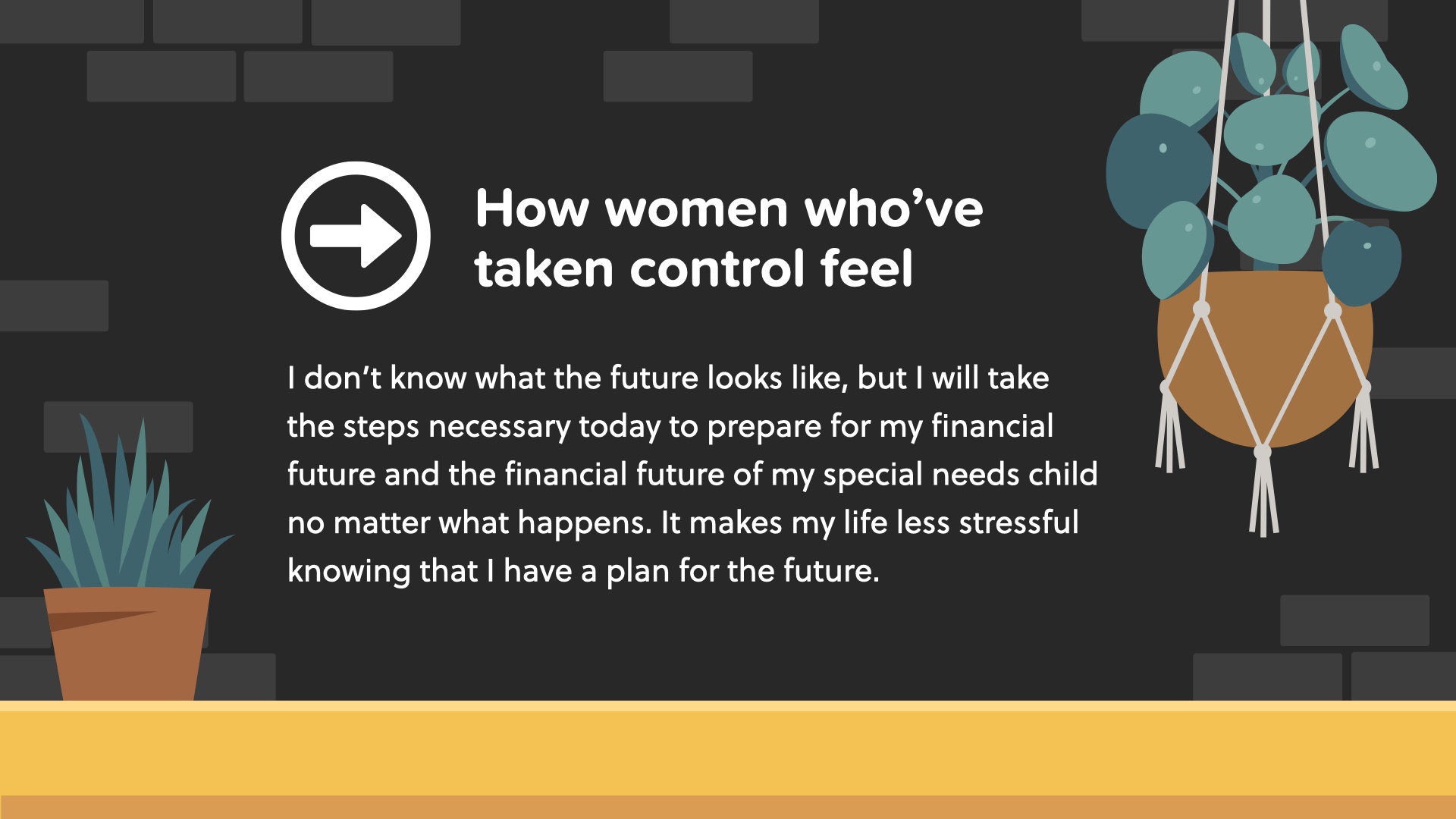 At the end of Val’s chapter, we hope the reader feels that she can take the steps necessary today to prepare for an uncertain financial future for herself and her child. Importantly, having plans in place now will help reduce the stress that caregivers already have in their lives.