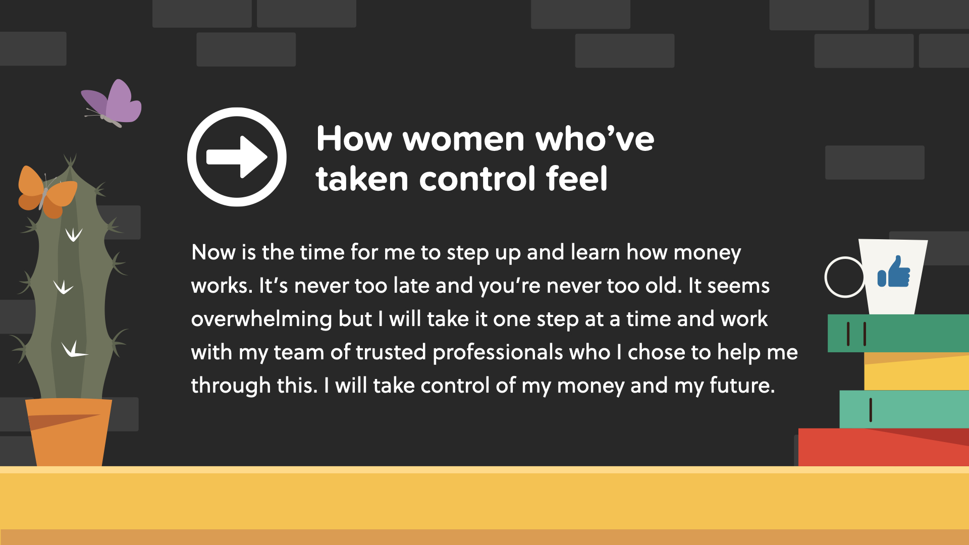 After reading this chapter, we want women to feel confident that they can step up and learn how money works. It’s never too late and you’re never too old. With the help of trusted professionals that you choose, you can take control of your money and financial future.